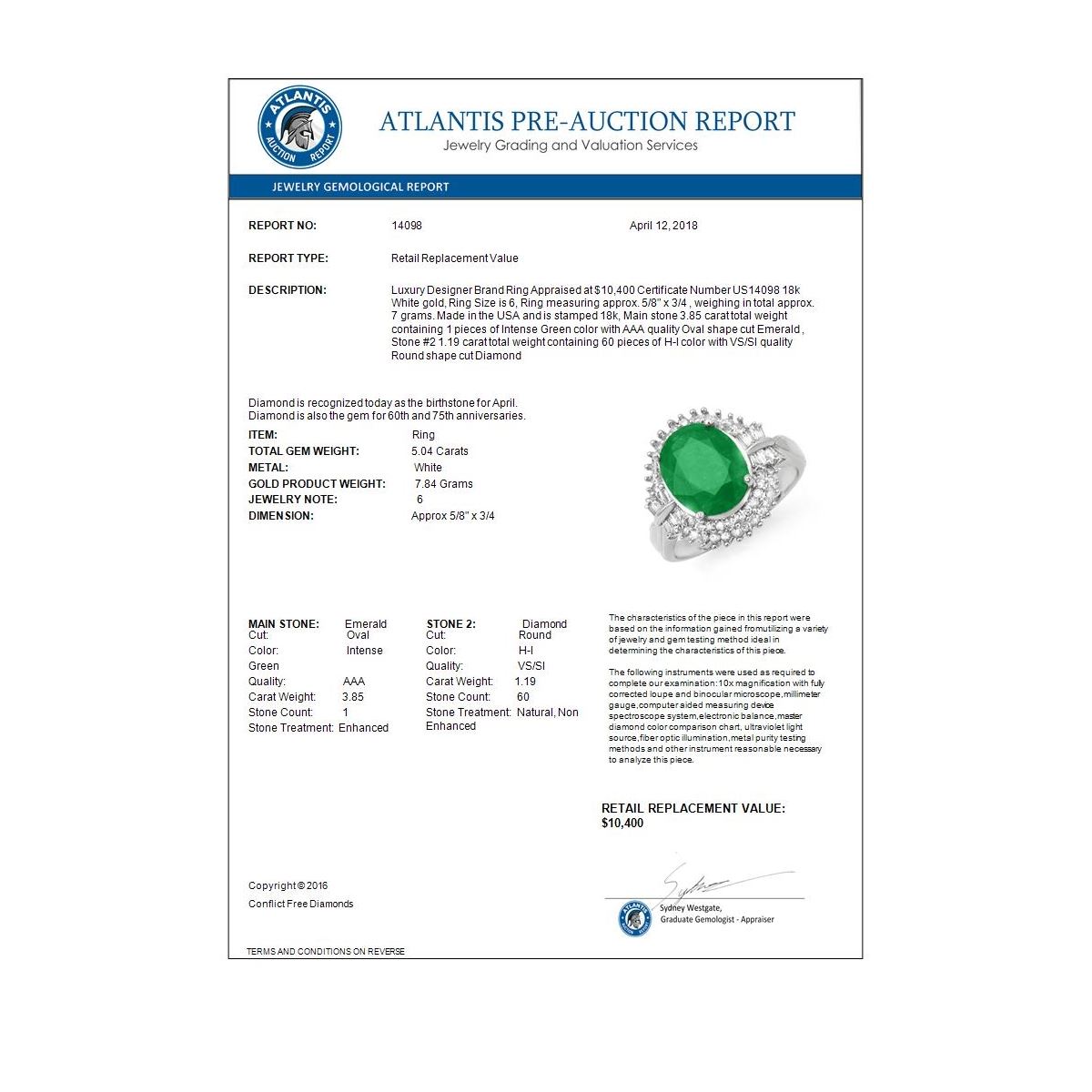REF-145Y5K -14098 ---- 5.04 CTW Emerald & Diamond Ring 18K White Gold ---- Luxury Designer Brand Ring Appraised at $10,400 Certificate Number US14098 18k White gold, Ring Size is 6, Ring measuring approx. 5/8" x 3/4 , weighing in total approx. 7 grams. Made in the USA and is stamped 18k, Main stone 3.85 carat total weight containing 1 pieces of Intense Green color with AAA quality Oval shape cut Emerald , Stone #2 1.19 carat total weight containing 60 pieces of H-I color with VS/SI quality Round shape cut Diamond