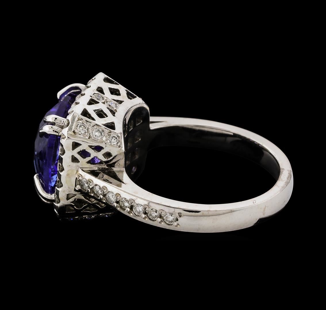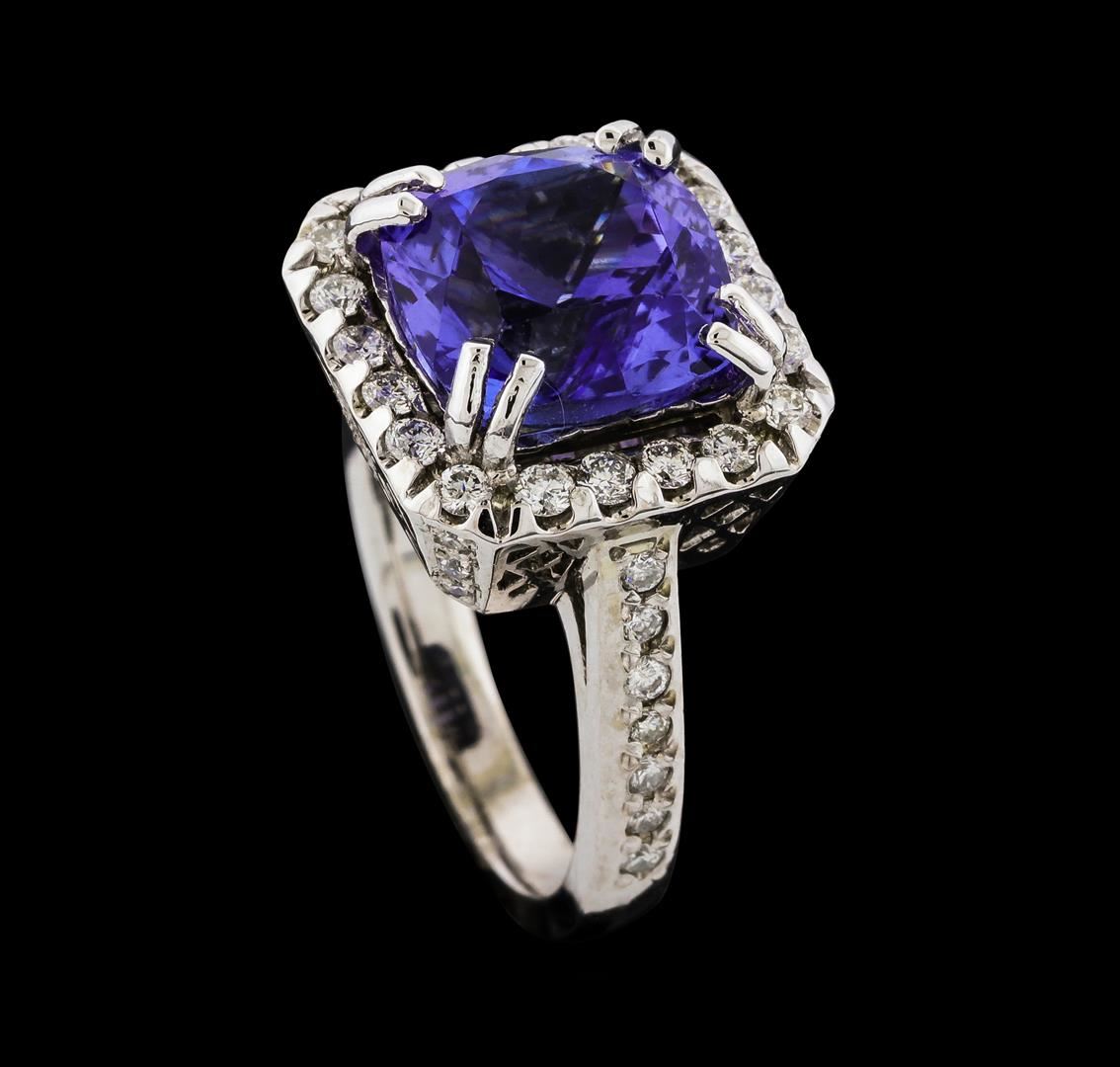 One electronically tested 14KT white gold lady's cast fashion ring with a cushion halo with a bright polish finish. The featured lady's ring has a shank measuring 2.71 millimeters wide. Identified with markings of '14K'. Condition is new, good workmanship. Containing: One prong set square cushion modified brilliant cut natural tanzanite, measuring 9.97 x 9.86 x 6.45mm, (depth est.) approximate weight of 5.04ct., clarity is eye clean, medium, moderately strong, bluish violet color, (GIA bV 5/4), cut is good. Transmitting light with no distortion, transparent. Colored gemstones are presumed to have been subjected to commonly used enhancement processes. Graded in the setting. Fourteen prong set round brilliant cut diamonds, measuring 2.10 - 2.00 x 1.25mm (depth est.) approximate total weight of 14 Stones = 0.45ct. Graded in the setting. Clarity SI-1 to SI-2. Color: H - I Cut Good Twenty prong set round brilliant cut diamonds, measuring 1.85 - 1.75 x 1.12mm (depth est.) approximate total weight of 20 Stones = 0.45ct. Graded in the setting. Clarity SI-1 to SI-2. Color: G - H Cut Good Sixteen prong set round brilliant cut diamonds, measuring 1.25 - 1.15 x 0.72mm (depth est.) approximate total weight of 16 Stones = 0.10ct. Graded in the setting. Clarity SI-1 to I-1. Color: H - I Cut Good. Total Weight of Colored Stones 5.04ct.. Total Weight of Diamonds 1.00ct.. Total Weight of Ring 7.90gm. GAS Appraised at $10,745.00.