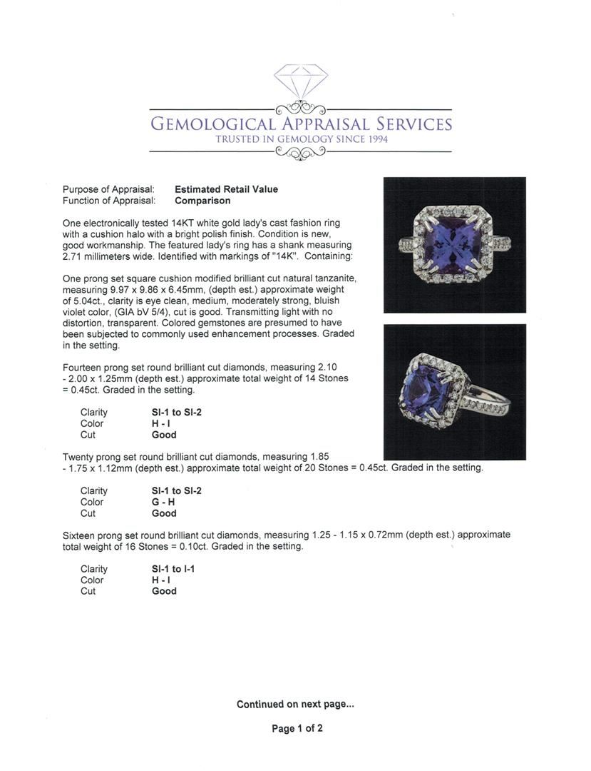 One electronically tested 14KT white gold lady's cast fashion ring with a cushion halo with a bright polish finish. The featured lady's ring has a shank measuring 2.71 millimeters wide. Identified with markings of '14K'. Condition is new, good workmanship. Containing: One prong set square cushion modified brilliant cut natural tanzanite, measuring 9.97 x 9.86 x 6.45mm, (depth est.) approximate weight of 5.04ct., clarity is eye clean, medium, moderately strong, bluish violet color, (GIA bV 5/4), cut is good. Transmitting light with no distortion, transparent. Colored gemstones are presumed to have been subjected to commonly used enhancement processes. Graded in the setting. Fourteen prong set round brilliant cut diamonds, measuring 2.10 - 2.00 x 1.25mm (depth est.) approximate total weight of 14 Stones = 0.45ct. Graded in the setting. Clarity SI-1 to SI-2. Color: H - I Cut Good Twenty prong set round brilliant cut diamonds, measuring 1.85 - 1.75 x 1.12mm (depth est.) approximate total weight of 20 Stones = 0.45ct. Graded in the setting. Clarity SI-1 to SI-2. Color: G - H Cut Good Sixteen prong set round brilliant cut diamonds, measuring 1.25 - 1.15 x 0.72mm (depth est.) approximate total weight of 16 Stones = 0.10ct. Graded in the setting. Clarity SI-1 to I-1. Color: H - I Cut Good. Total Weight of Colored Stones 5.04ct.. Total Weight of Diamonds 1.00ct.. Total Weight of Ring 7.90gm. GAS Appraised at $10,745.00.