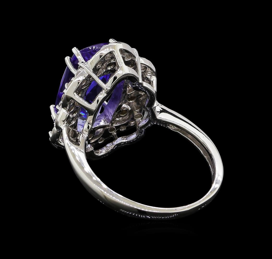 One electronically tested 14KT white gold lady's cast fashion ring with a scalloped basket halo with a bright polish finish. The featured lady's ring has a shank measuring 1.75 millimeters wide. Identified with markings of 'K14'. Condition is new, good workmanship. Containing: One prong set rectangular cushion modified brilliant cut natural tanzanite, measuring 13.53 x 7.68 x 5.38mm, (depth est.) 15%. bulge factor, approximate weight of 5.04ct., clarity is eye clean, medium light, moderately strong, violetish blue color, (GIA vB 4/4), cut is very good. Transmitting light with no distortion, transparent. Colored gemstones are presumed to have been subjected to commonly used enhancement processes. Graded in the setting. Four prong set round brilliant cut diamonds, measuring 2.05 - 1.95 x 1.24mm (depth est.) approximate total weight of 4 Stones = 0.12ct. Graded in the setting. Clarity SI-1 to SI-2. Color: H - I Cut Very Good Ten prong set round brilliant cut diamonds, measuring 1.75 - 1.65 x 1.02mm (depth est.) approximate total weight of 10 Stones = 0.18ct. Graded in the setting. Clarity SI-1 to I-1. Color: H - I Cut Good Thirty-Two prong set round brilliant cut diamonds, measuring 1.50 - 1.40 x 0.90mm (depth est.) approximate total weight of 32 Stones = 0.38ct. Graded in the setting. Clarity SI-1 to I-1. Color: H - I Cut Good. Total Weight of Colored Stones 5.04ct.. Total Weight of Diamonds 0.68ct.. Total Weight of Ring 6.20gm GAS Appraised at $9,405.00.
