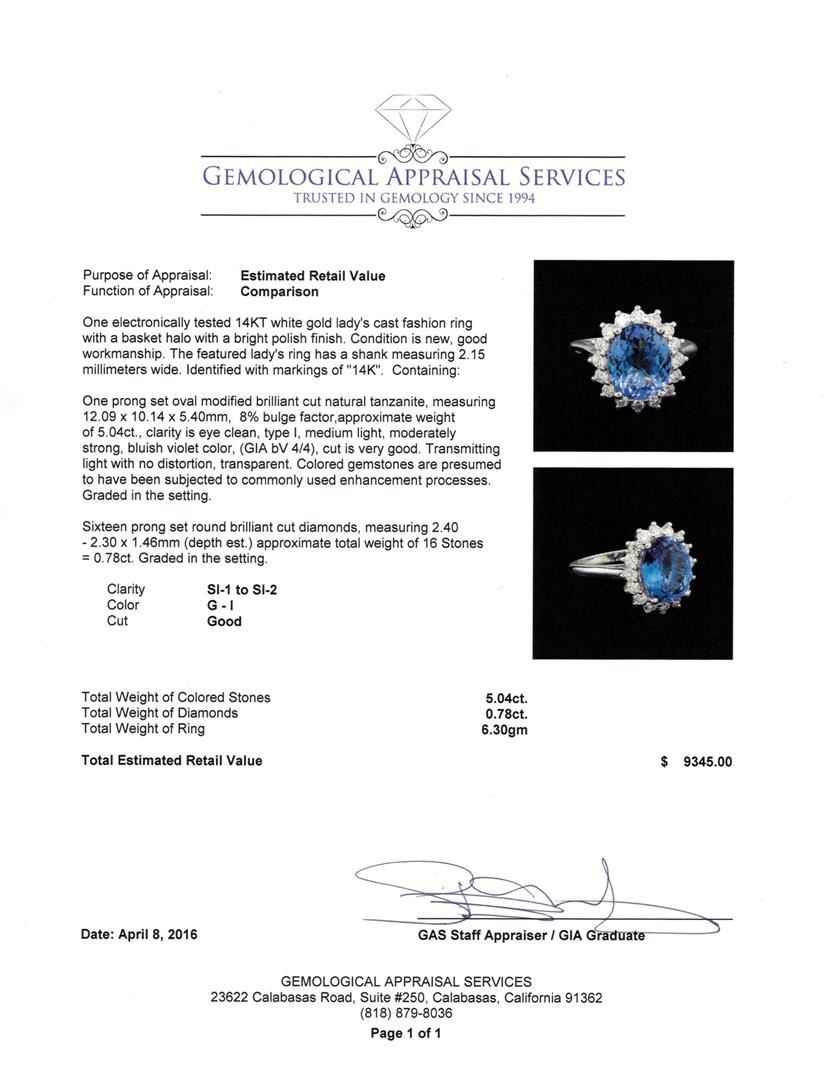 One electronically tested 14KT white gold lady's cast fashion ring with a basket halo with a bright polish finish. The featured lady's ring has a shank measuring 2.15 millimeters wide. Identified with markings of "14K". Condition is new, good workmanship. Containing: One prong set oval modified brilliant cut natural tanzanite, measuring 12.09 x 10.14 x 5.40mm, 8%. bulge factor, approximate weight of 5.04ct., clarity is eye clean, type I, medium light, moderately strong, bluish violet color, (GIA bV 4/4), cut is very good. Transmitting light with no distortion, transparent. Colored gemstones are presumed to have been subjected to commonly used enhancement processes. Graded in the setting. Sixteen prong set round brilliant cut diamonds, measuring 2.40 - 2.30 x 1.46mm (depth est.) approximate total weight of 16 Stones = 0.78ct. Graded in the setting. Clarity: SI-1 to SI-2. Color: G - I. Cut Good. Total Weight of Colored Stones 5.04ct. Total Weight of Diamonds 0.78ct. Total Weight of Ring 6.30gm. GAS Appraised at $9,345.00.