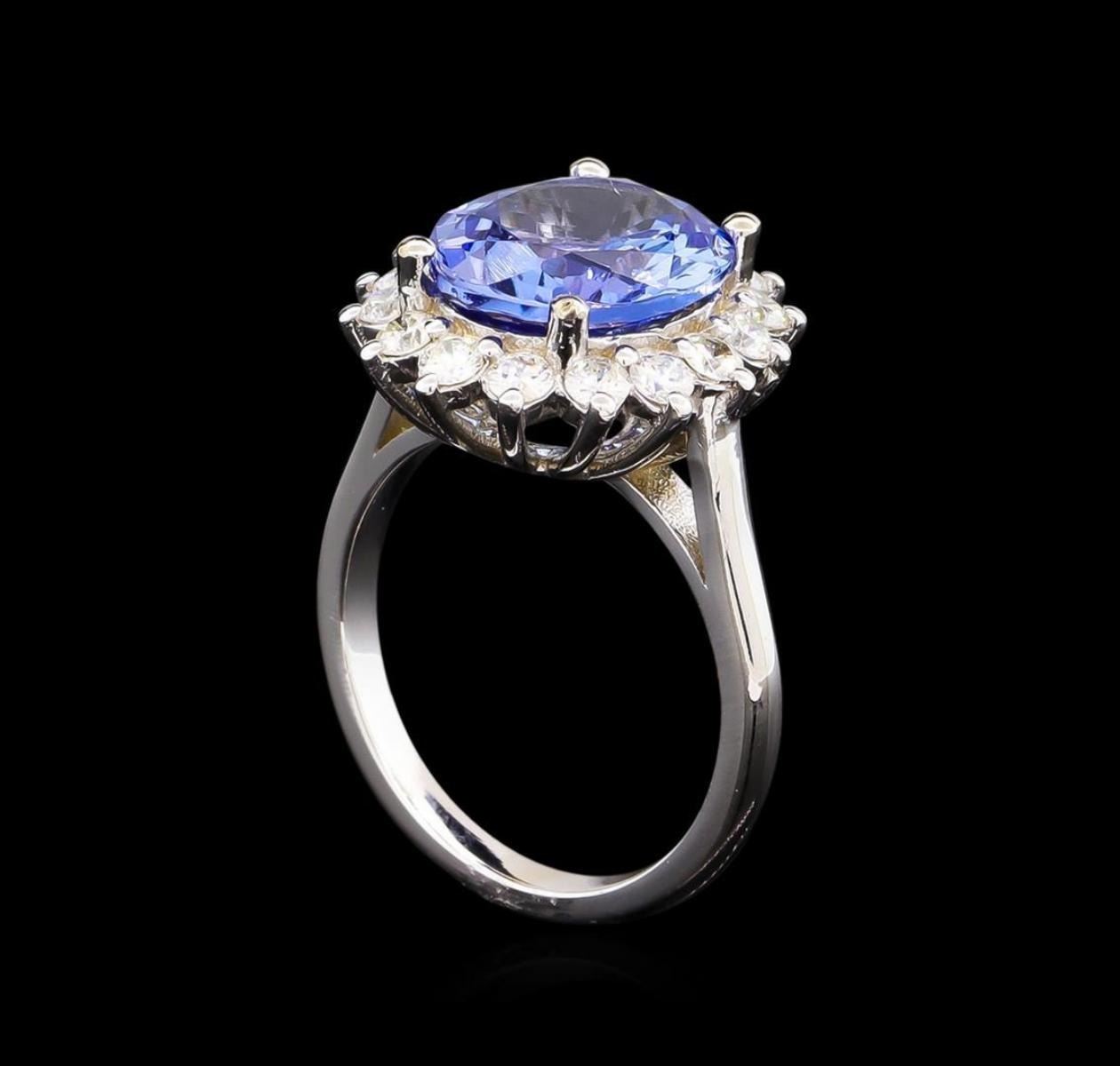 One electronically tested 14KT white gold lady's cast fashion ring with a basket halo with a bright polish finish. The featured lady's ring has a shank measuring 2.15 millimeters wide. Identified with markings of "14K". Condition is new, good workmanship. Containing: One prong set oval modified brilliant cut natural tanzanite, measuring 12.09 x 10.14 x 5.40mm, 8%. bulge factor, approximate weight of 5.04ct., clarity is eye clean, type I, medium light, moderately strong, bluish violet color, (GIA bV 4/4), cut is very good. Transmitting light with no distortion, transparent. Colored gemstones are presumed to have been subjected to commonly used enhancement processes. Graded in the setting. Sixteen prong set round brilliant cut diamonds, measuring 2.40 - 2.30 x 1.46mm (depth est.) approximate total weight of 16 Stones = 0.78ct. Graded in the setting. Clarity: SI-1 to SI-2. Color: G - I. Cut Good. Total Weight of Colored Stones 5.04ct. Total Weight of Diamonds 0.78ct. Total Weight of Ring 6.30gm. GAS Appraised.