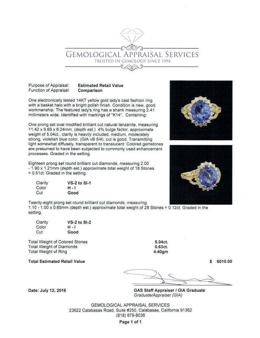 One electronically tested 14KT yellow gold lady's cast fashion ring with a basket halo with a bright polish finish. The featured lady's ring has a shank measuring 2.41 millimeters wide. Identified with markings of 'K14'. Condition is new, good workmanship. Containing: One prong set oval modified brilliant cut natural tanzanite, measuring 11.42 x 9.69 x 6.24mm, (depth est.) 4%. bulge factor, approximate weight of 5.04ct., clarity is heavily included, medium, moderately strong, violetish blue color, (GIA vB 5/4), cut is good. Transmitting light somewhat diffusely, transparent to translucent. Colored gemstones are presumed to have been subjected to commonly used enhancement processes. Graded in the setting. Eighteen prong set round brilliant cut diamonds, measuring 2.00 - 1.90 x 1.21mm (depth est.) approximate total weight of 18 Stones = 0.51ct. Graded in the setting. Clarity VS-2 to SI-1. Color: H - I Cut Good Twenty-Eight prong set round brilliant cut diamonds, measuring 1.10 - 1.00 x 0.65mm (depth est.) approximate total weight of 28 Stones = 0.12ct. Graded in the setting. Clarity VS-2 to SI-2. Color: H - I Cut Good. Total Weight of Colored Stones 5.04ct.. Total Weight of Diamonds 0.63ct.. Total Weight of Ring 4.40gm. GAS Appraised at $6,010.00.