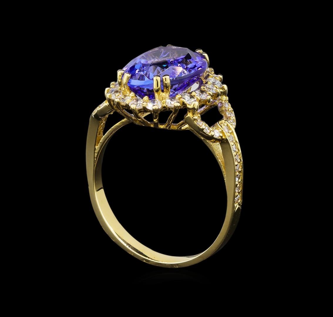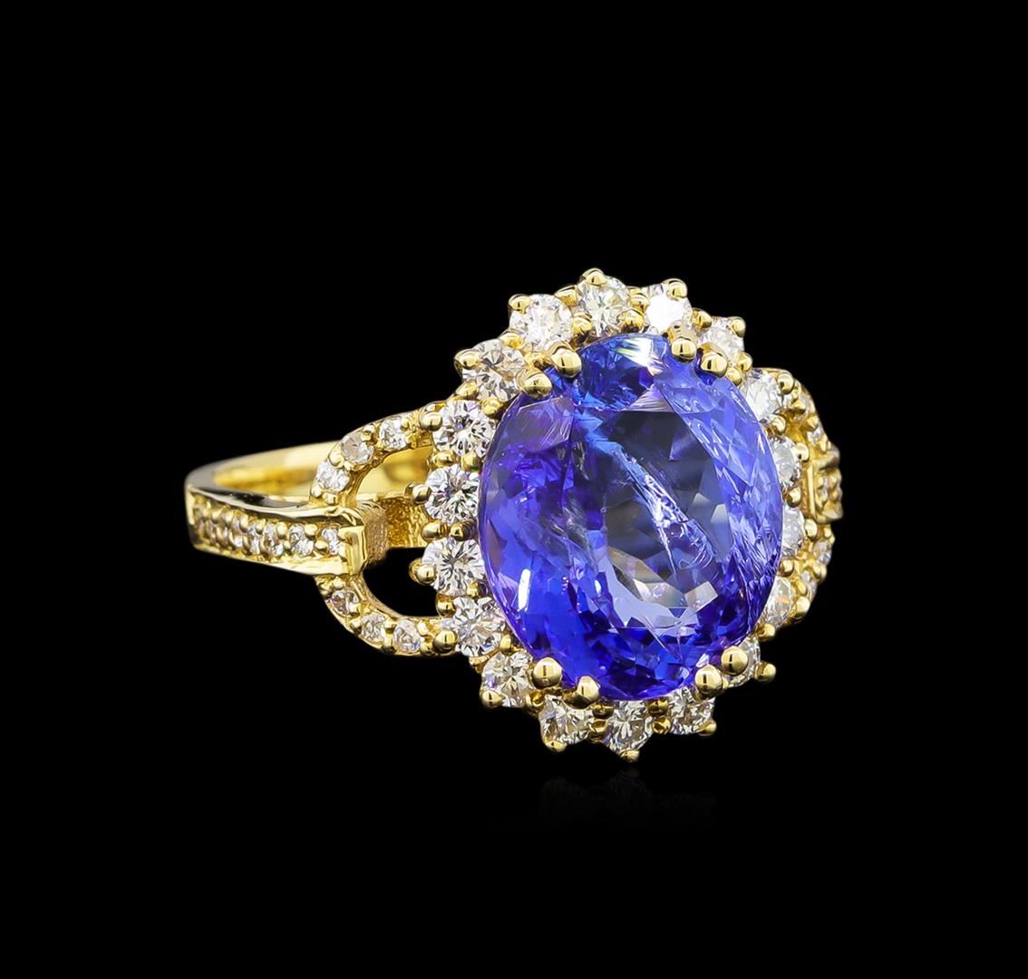 One electronically tested 14KT yellow gold lady's cast fashion ring with a basket halo with a bright polish finish. The featured lady's ring has a shank measuring 2.41 millimeters wide. Identified with markings of 'K14'. Condition is new, good workmanship. Containing: One prong set oval modified brilliant cut natural tanzanite, measuring 11.42 x 9.69 x 6.24mm, (depth est.) 4%. bulge factor, approximate weight of 5.04ct., clarity is heavily included, medium, moderately strong, violetish blue color, (GIA vB 5/4), cut is good. Transmitting light somewhat diffusely, transparent to translucent. Colored gemstones are presumed to have been subjected to commonly used enhancement processes. Graded in the setting. Eighteen prong set round brilliant cut diamonds, measuring 2.00 - 1.90 x 1.21mm (depth est.) approximate total weight of 18 Stones = 0.51ct. Graded in the setting. Clarity VS-2 to SI-1. Color: H - I Cut Good Twenty-Eight prong set round brilliant cut diamonds, measuring 1.10 - 1.00 x 0.65mm (depth est.) approximate total weight of 28 Stones = 0.12ct. Graded in the setting. Clarity VS-2 to SI-2. Color: H - I Cut Good. Total Weight of Colored Stones 5.04ct.. Total Weight of Diamonds 0.63ct.. Total Weight of Ring 4.40gm. GAS Appraised at $6,010.00.