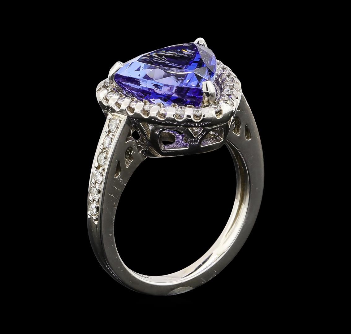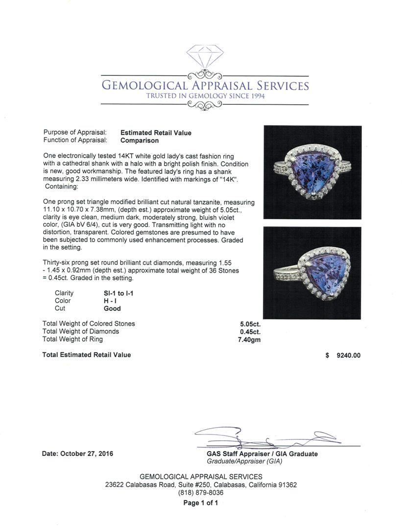 One electronically tested 14KT white gold lady's cast fashion ring with a cathedral shank with a halo with a bright polish finish. The featured lady's ring has a shank measuring 2.33 millimeters wide. Identified with markings of '14K'. Condition is new, good workmanship. Containing: One prong set triangle modified brilliant cut natural tanzanite, measuring 11.10 x 10.70 x 7.38mm, (depth est.) approximate weight of 5.05ct., clarity is eye clean, medium dark, moderately strong, bluish violet color, (GIA bV 6/4), cut is very good. Transmitting light with no distortion, transparent. Colored gemstones are presumed to have been subjected to commonly used enhancement processes. Graded in the setting. Thirty-Six prong set round brilliant cut diamonds, measuring 1.55 - 1.45 x 0.92mm (depth est.) approximate total weight of 36 Stones = 0.45ct. Graded in the setting. Clarity SI-1 to I-1. Color: H - I Cut Good. Total Weight of Colored Stones 5.05ct.. Total Weight of Diamonds 0.45ct.. Total Weight of Ring 7.40gm. GAS Appraised at $9,240.00.