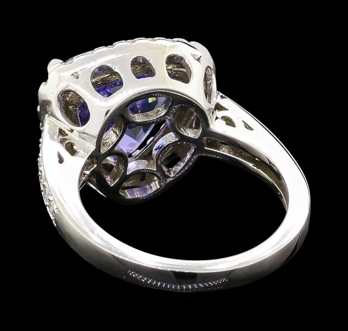 One electronically tested 14KT white gold lady's cast fashion ring with a cathedral shank with a halo with a bright polish finish. The featured lady's ring has a shank measuring 2.33 millimeters wide. Identified with markings of '14K'. Condition is new, good workmanship. Containing: One prong set triangle modified brilliant cut natural tanzanite, measuring 11.10 x 10.70 x 7.38mm, (depth est.) approximate weight of 5.05ct., clarity is eye clean, medium dark, moderately strong, bluish violet color, (GIA bV 6/4), cut is very good. Transmitting light with no distortion, transparent. Colored gemstones are presumed to have been subjected to commonly used enhancement processes. Graded in the setting. Thirty-Six prong set round brilliant cut diamonds, measuring 1.55 - 1.45 x 0.92mm (depth est.) approximate total weight of 36 Stones = 0.45ct. Graded in the setting. Clarity SI-1 to I-1. Color: H - I Cut Good. Total Weight of Colored Stones 5.05ct.. Total Weight of Diamonds 0.45ct.. Total Weight of Ring 7.40gm. GAS Appraised at $9,240.00.