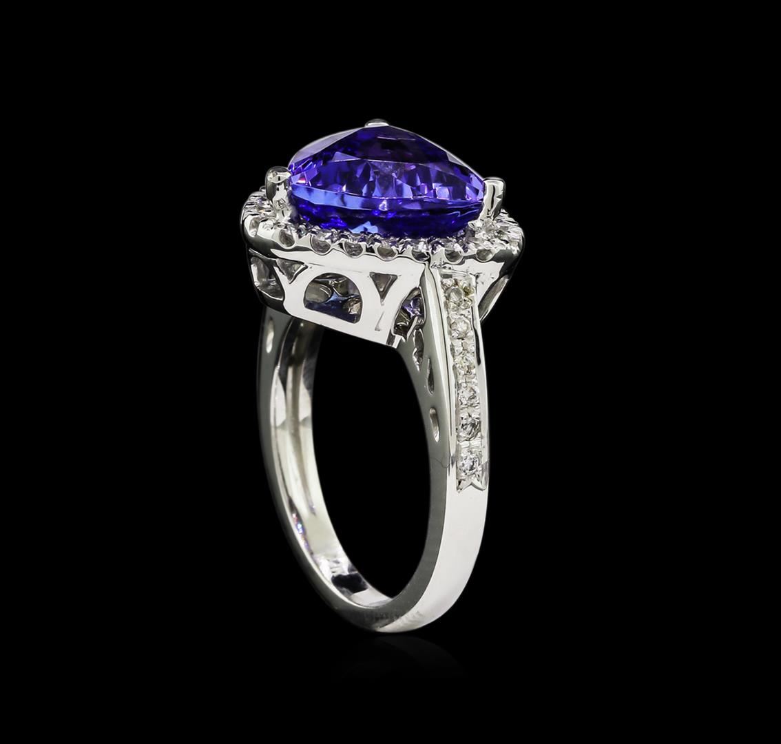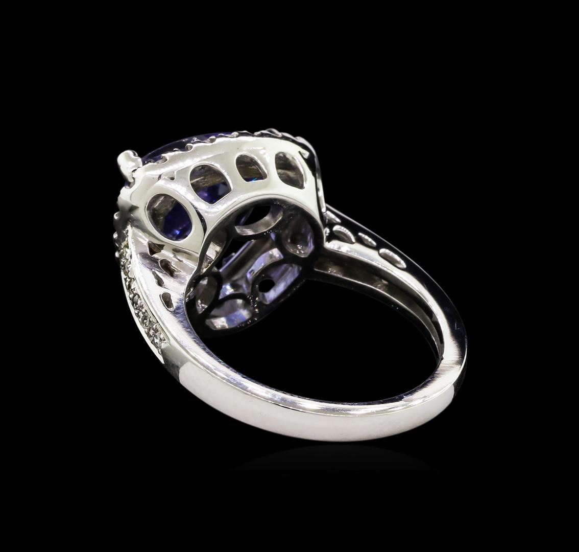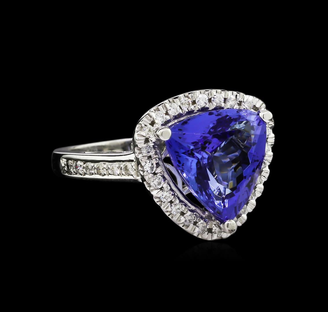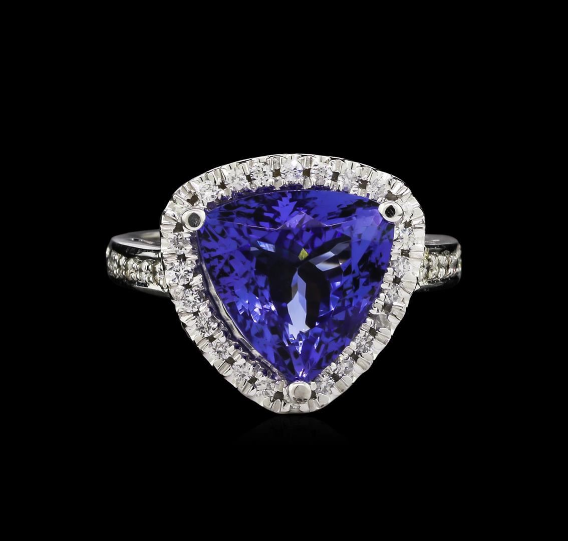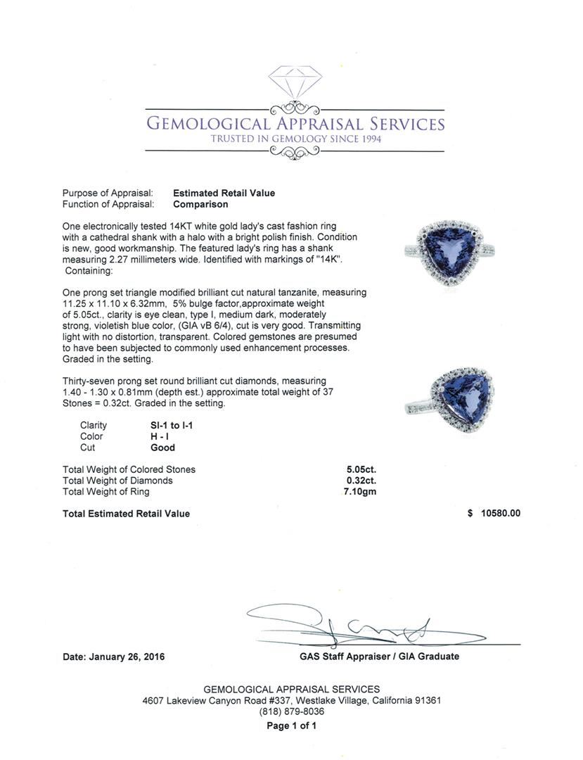 One electronically tested 14KT white gold lady's cast fashion ring with a cathedral shank with a halo with a bright polish finish. The featured lady's ring has a shank measuring 2.27 millimeters wide. Identified with markings of "14K". Condition is new, good workmanship. Containing: One prong set triangle modified brilliant cut natural tanzanite, measuring 11.25 x 11.10 x 6.32mm, 5%. bulge factor, approximate weight of 5.05ct., clarity is eye clean, type I, medium dark, moderately strong, violetish blue color, (GIA vB 6/4), cut is very good. Transmitting light with no distortion, transparent. Colored gemstones are presumed to have been subjected to commonly used enhancement processes. Graded in the setting. Thirty-Seven prong set round brilliant cut diamonds, measuring 1.40 - 1.30 x 0.81mm (depth est.) approximate total weight of 37 Stones = 0.32ct. Graded in the setting. Clarity: SI-1 to I-1. Color: H - I. Cut Good. Total Weight of Colored Stones 5.05ct. Total Weight of Diamonds 0.32ct. Total Weight of Ring 7.10gm. GAS Appraised at $10,580.00.