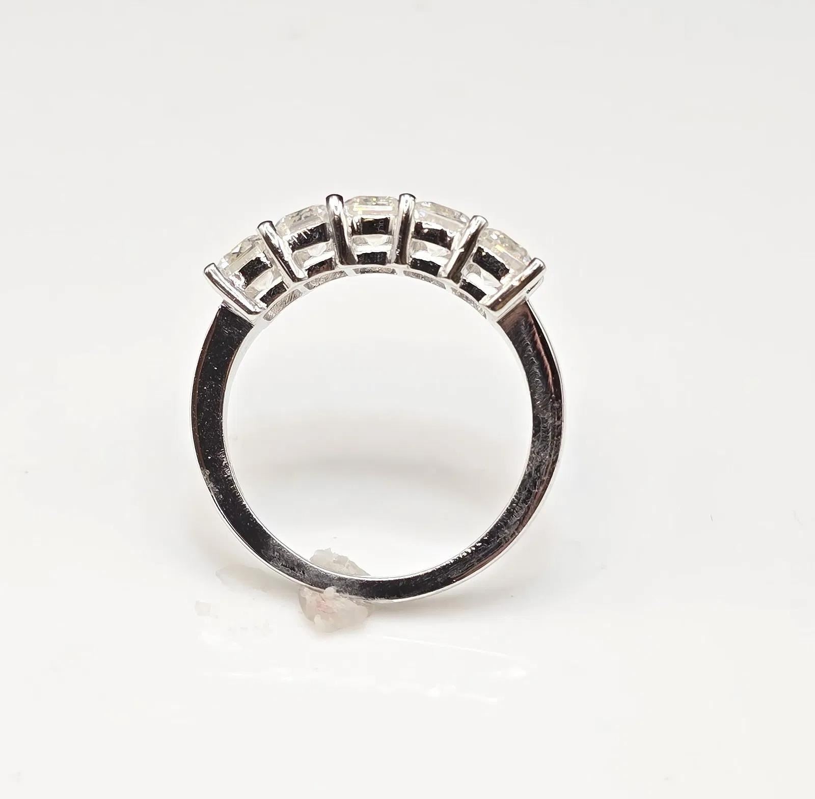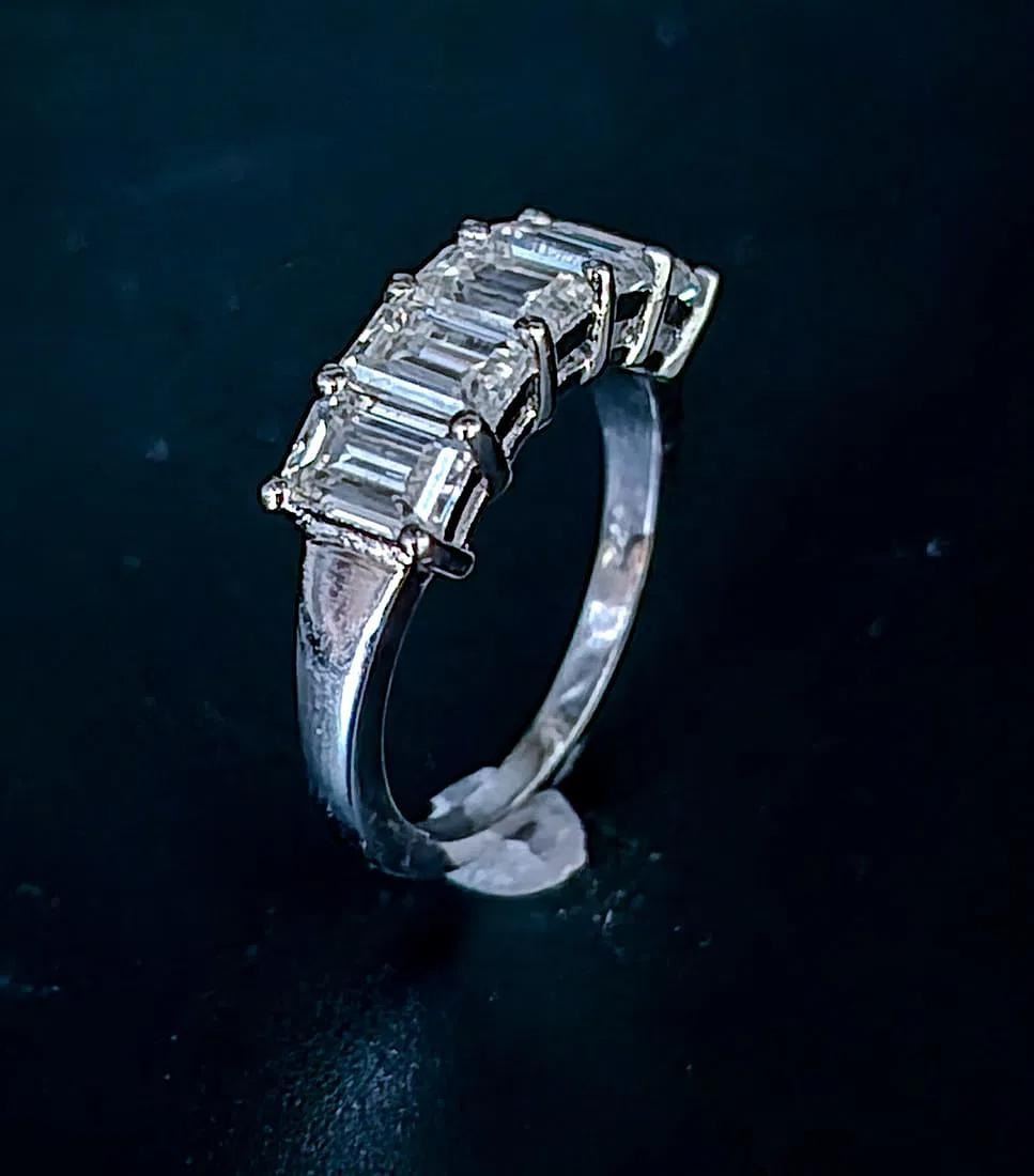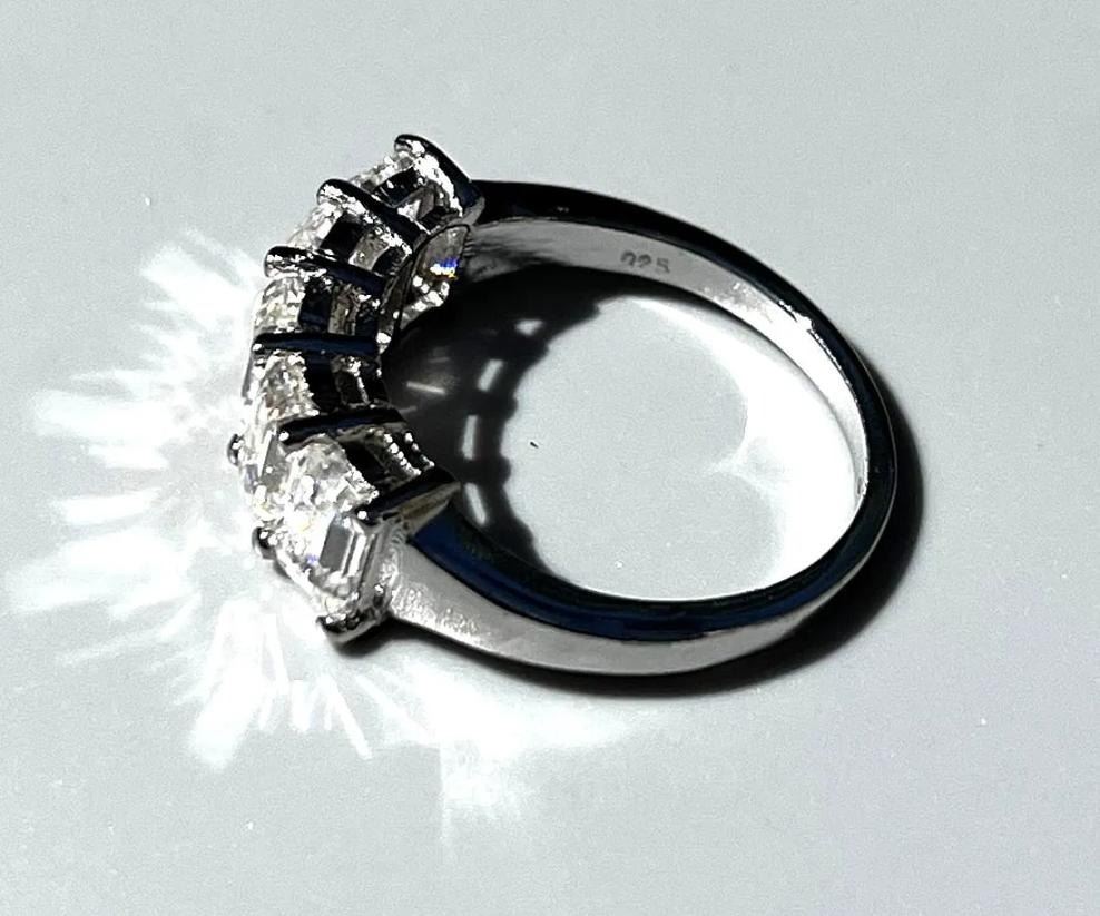 These 5 Emerald Cut Moissanites are VVs1 Clarity and D-E in color measuring approx. 6.5 x 4.5 mm. These investment grade Moissanites are near flawless and bursting out with a full spectrum of colors. They are mounted in solid .925 sterling silver complimented 14 Kt White Gold Overlay, which gives the ring its high polish and shine. With a refractive index of 2.65-2.69, this Moissanite exhibits more fire and brilliance than a natural diamond thanks to a dispersion that is 2.4 times higher. It is also conflict free and earth friendly. These Moissanites measures 9.25 on the mohs hardness scale and will test positive for a diamond on almost any diamond tester. Total weight of this ring is approx. 3.4 grams. Ring size 8.
