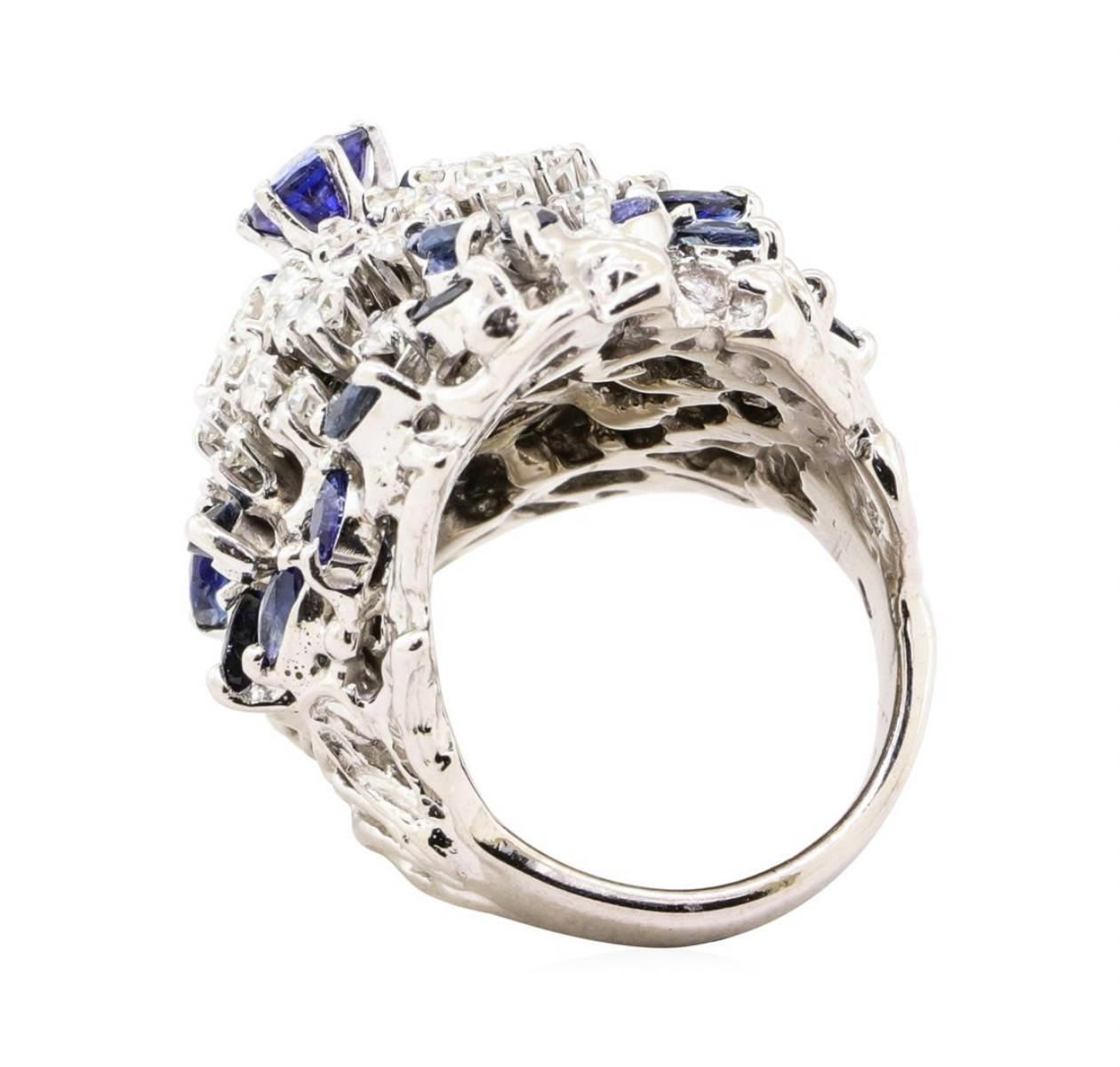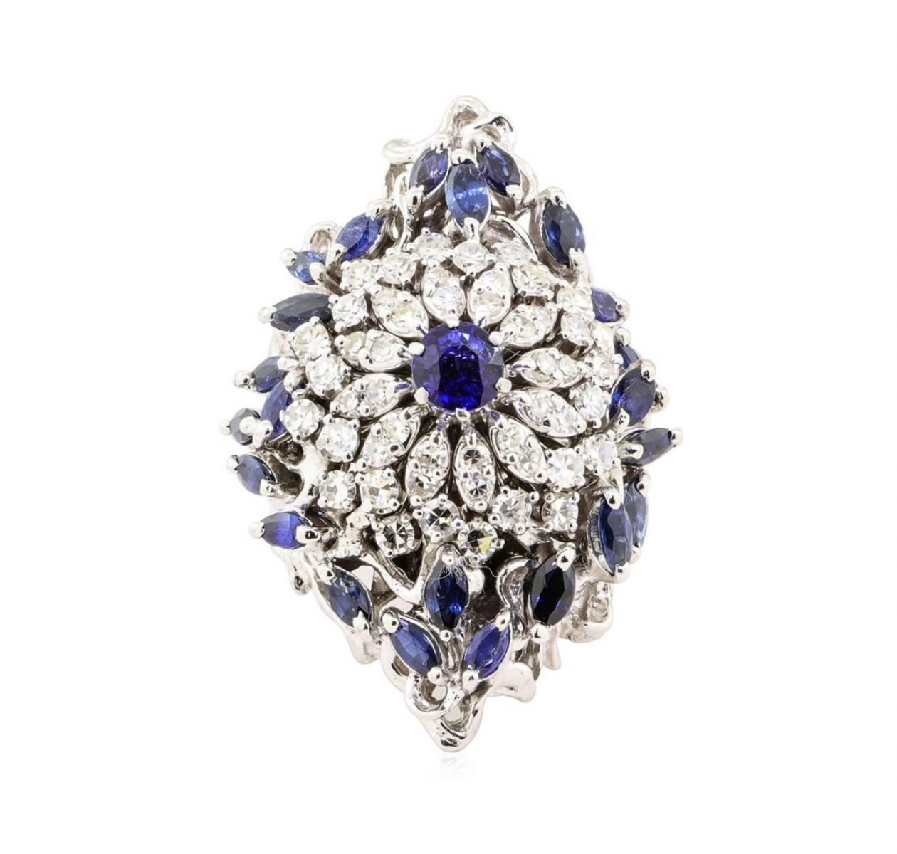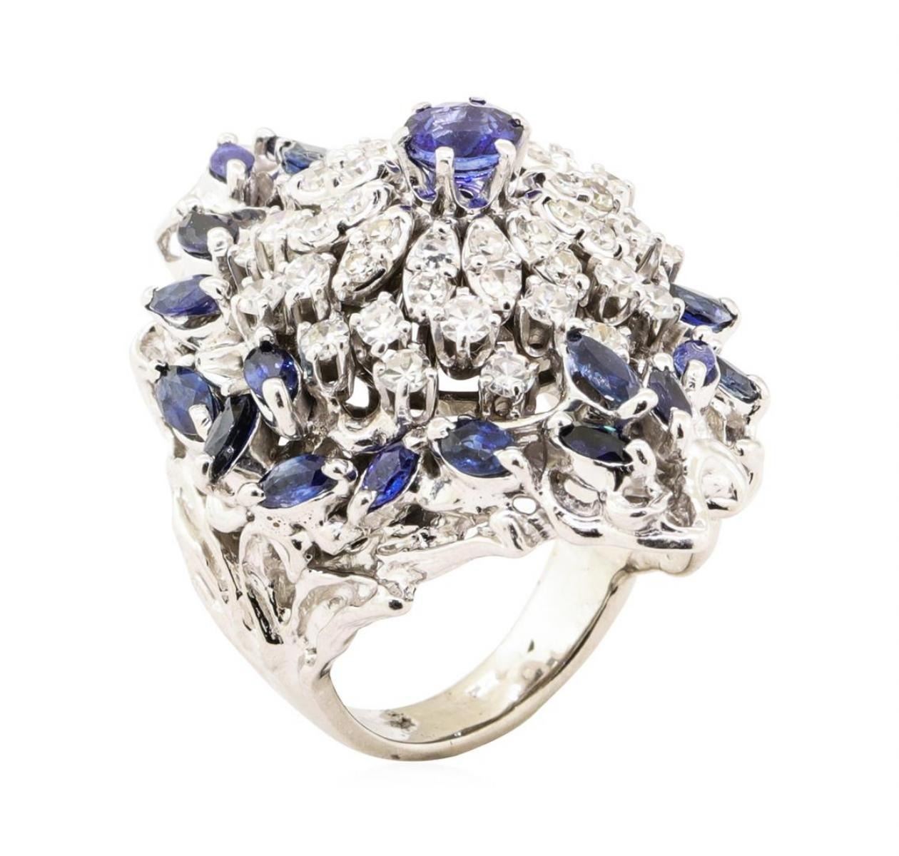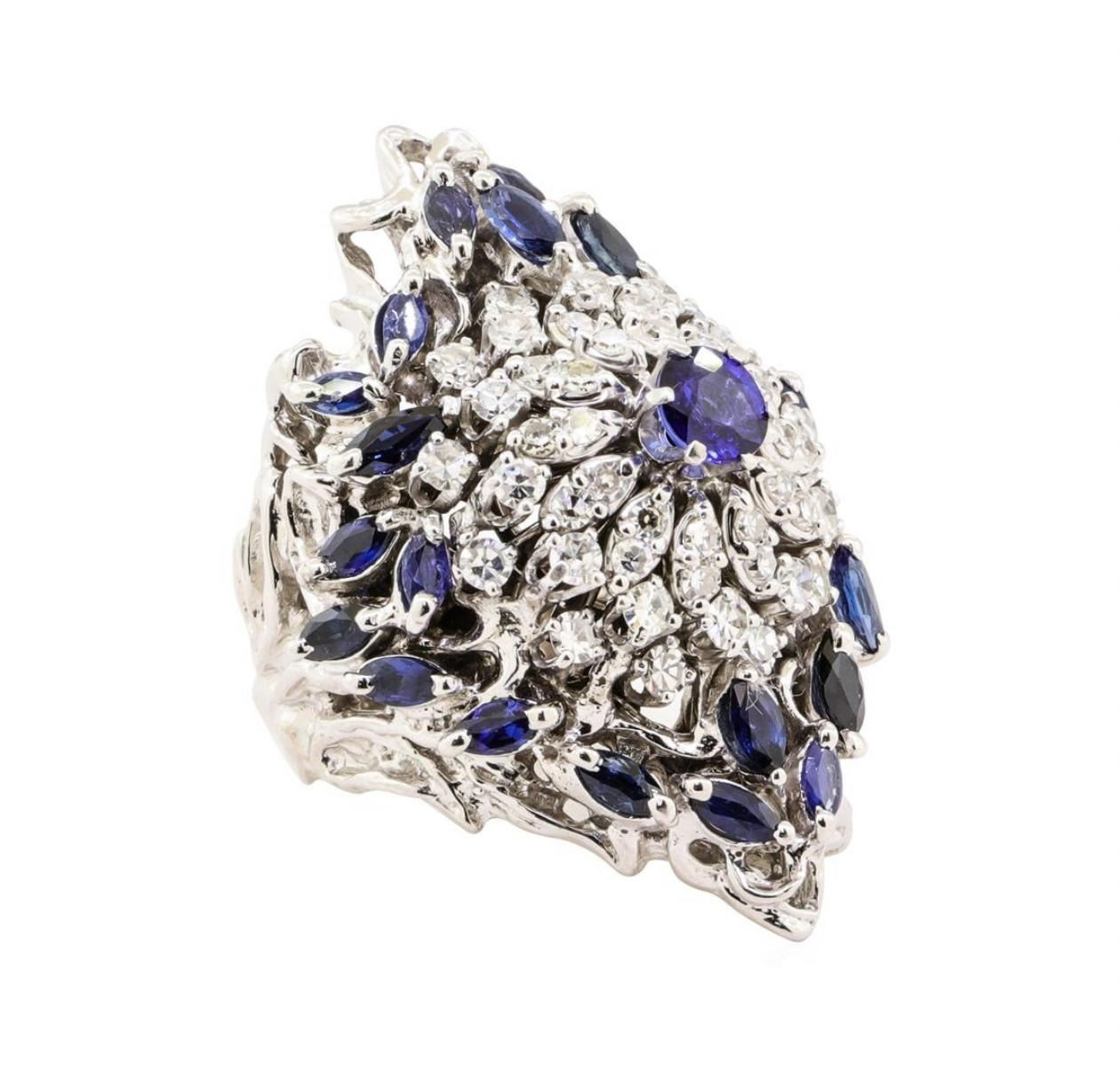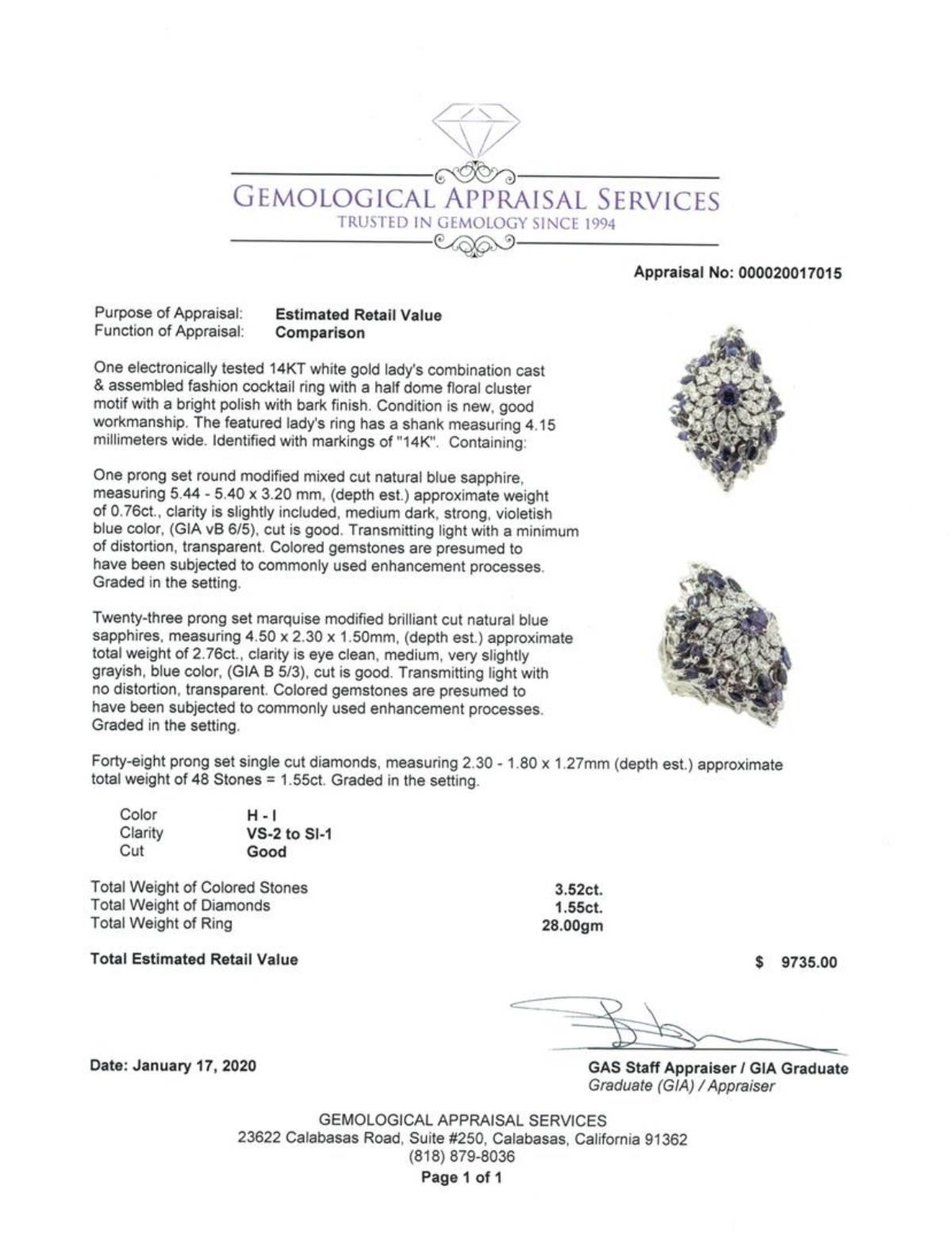 One electronically tested 14KT white gold lady's combination cast & assembled fashion cocktail ring with a half dome floral cluster motif with a bright polish with bark finish. The featured lady's ring has a shank measuring 4.15 millimeters wide. Identified with markings of '14K'. Condition is new, good workmanship. Containing: One prong set round modified mixed cut natural blue sapphire, measuring 5.44 - 5.40 x 3.20 mm, (depth est.) approximate weight of 0.76ct., clarity is slightly included, medium dark, strong, violetish blue color, (GIA vB 6/5), cut is good. Transmitting light with a minimum of distortion, transparent. Colored gemstones are presumed to have been subjected to commonly used enhancement processes. Graded in the setting. Twenty-three prong set marquise modified brilliant cut natural blue sapphires, measuring 4.50 x 2.30 x 1.50mm, (depth est.) approximate total weight of 2.76ct., clarity is eye clean, medium, very slightly grayish, blue color, (GIA B 5/3), cut is good. Transmitting light with no distortion, transparent. Colored gemstones are presumed to have been subjected to commonly used enhancement processes. Graded in the setting. Forty-Eight prong set single cut diamonds, measuring 2.30 - 1.80 x 1.27mm (depth est.) approximate total weight of 48 Stones = 1.55ct. Graded in the setting. Color H - I Clarity VS-2 to SI-1 Cut Good. Total Weight of Colored Stones 3.52ct.. Total Weight of Diamonds 1.55ct.. Total Weight of Ring 28.00gm GAS Appraised at  $9735.00. GAS Appraised.