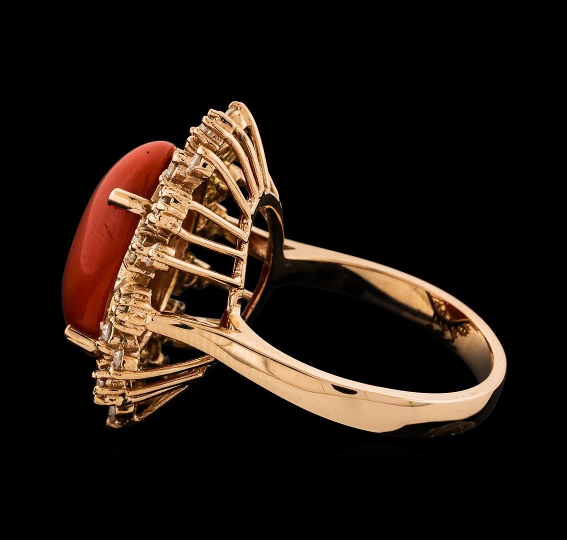 One Coral and Diamond Ring featuring: 14KT Rose Gold with a total weight of 5.65 grams, Coral with a total weight of 5.07ct, and 24 diamonds with a total weight of 0.65ctw.