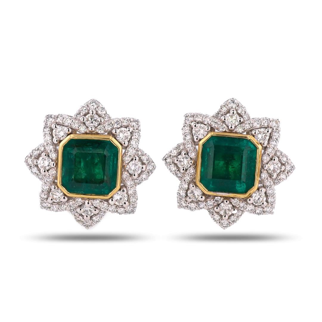 One electronically tested pair of platinum & 18K yellow gold earrings marked Oscar Friedman. The earrings are mounted with: 2 genuine emerald center stones weighing approximately 5.08 carats, and 128 genuine round diamonds weighing approximately 1.37 carats. This item weighs 11.5 grams, condition is new, excellent workmanship. #MAIN GEMSTONES# Species: Natural Beryl; Variety: Emerald; Shape: Octagonal; Cutting Style: Step Cut; Quantity: 2 Emeralds; Measurements: 7.5 x 7.5mm; Total Weight: 5.08 carats; Color: Green; Cut Grade: Very Good; Refractive Index: 1.564 - 1.595 DR; Birefringence: 0.005 to 0.009; Hardness: 7.5 - 8 #ADJACENT GEMSTONES ON EARRINGS# Identity: Natural Diamond; Shape: Round; Cutting Style: Brilliant Cut; Quantity: 128 Diamonds; Measurements: 1.0 - 2.0mm; Total Weight: 1.37 carats; Color Grade: F-G; Clarity Grade: VS1-SI1; Refractive Index: 2.417; Hardness: 10 #TOTAL EMERALD WEIGHT: 5.08 cts; TOTAL DIAMOND WEIGHT: 1.37 cts; WEIGHT OF ITEM: 11.5 grams; METAL: Platinum & 18K Yellow Gold