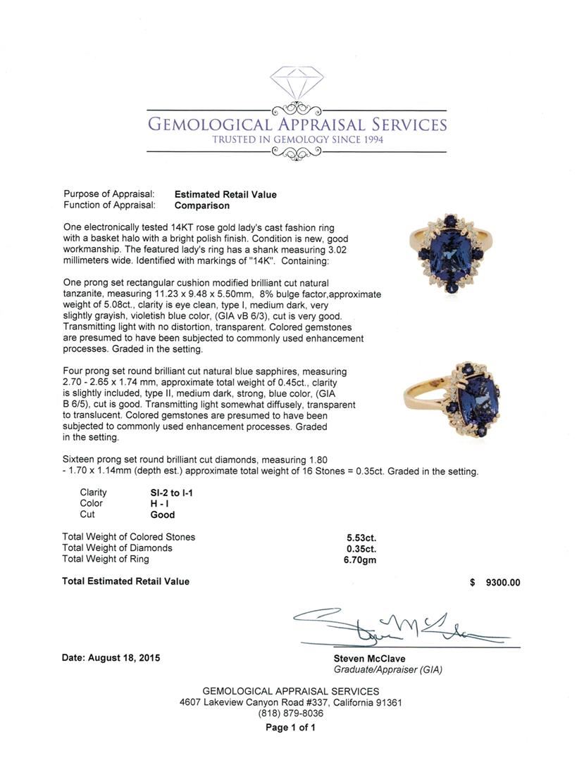 One electronically tested 14KT rose gold lady's cast fashion ring with a basket halo with a bright polish finish. The featured lady's ring has a shank measuring 3.02 millimeters wide. Identified with markings of "14K". Condition is new, good workmanship. Containing: One prong set rectangular cushion modified brilliant cut natural tanzanite, measuring 11.23 x 9.48 x 5.50mm, 8% bulge factor, approximate weight of 5.08ct., clarity is eye clean, type I, medium dark, very slightly grayish, violetish blue color, (GIA vB 6/3), cut is very good. Transmitting light with no distortion, transparent. Colored gemstones are presumed to have been subjected to commonly used enhancement processes. Graded in the setting. Four prong set round brilliant cut natural blue sapphires, measuring 2.70 - 2.65 x 1.74 mm, approximate total weight of 0.45ct., clarity is slightly included, type II, medium dark, strong, blue color, (GIA B 6/5), cut is good. Transmitting light somewhat diffusely, transparent to translucent. Colored gemstones are presumed to have been subjected to commonly used enhancement processes. Graded in the setting. Sixteen prong set round brilliant cut diamonds, measuring 1.80 - 1.70 x 1.14mm (depth est.) approximate total weight of 16 Stones = 0.35ct. Graded in the setting. Clarity: SI-2 to I-1. Color: H - I. Cut Good. Total Weight of Colored Stones 5.53ct. Total Weight of Diamonds 0.35ct. Total Weight of Ring 6.70gm. GAS Appraised at $9,300.00.