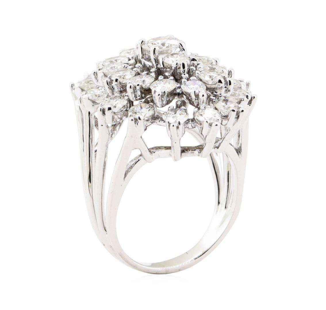 One electronically tested 14KT white gold lady's combination cast & assembled fashion ring with a wire basket halo with a bright polish finish. The featured lady's ring has a shank measuring 3.25 millimeters wide. Condition is Good. Containing: One prong set round brilliant cut diamond, measuring 5.24 - 5.21 x 3.24mm (depth est.) approximate weight of 0.54ct. Graded in the setting. Color I - J Clarity I-1 Cut Very Good Twenty-Eight prong set round brilliant cut diamonds, measuring 3.60 - 3.40 x 2.17mm (depth est.) approximate total weight of 28 Stones = 4.55ct. Graded in the setting. Color H - J Clarity SI-2 to I-1 Cut Good. Total Weight of Diamonds 5.09ct.. Total Weight of Ring 14.40gm GAS Appraised at $15495.00. GAS Appraised.