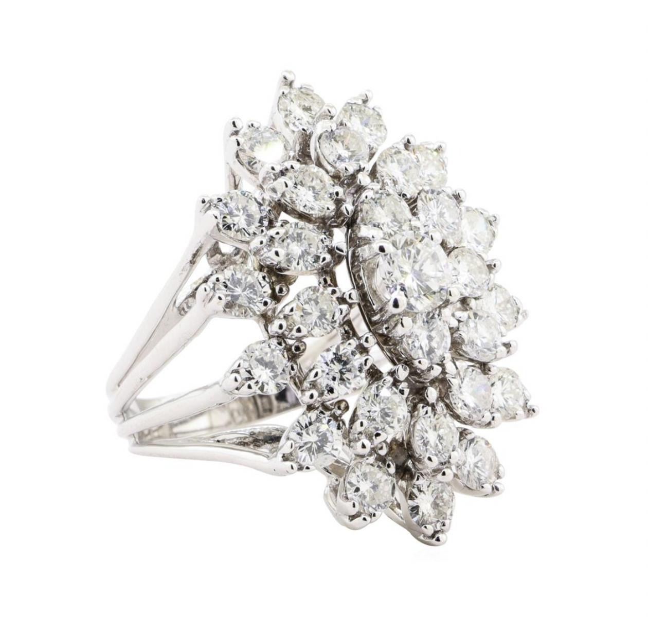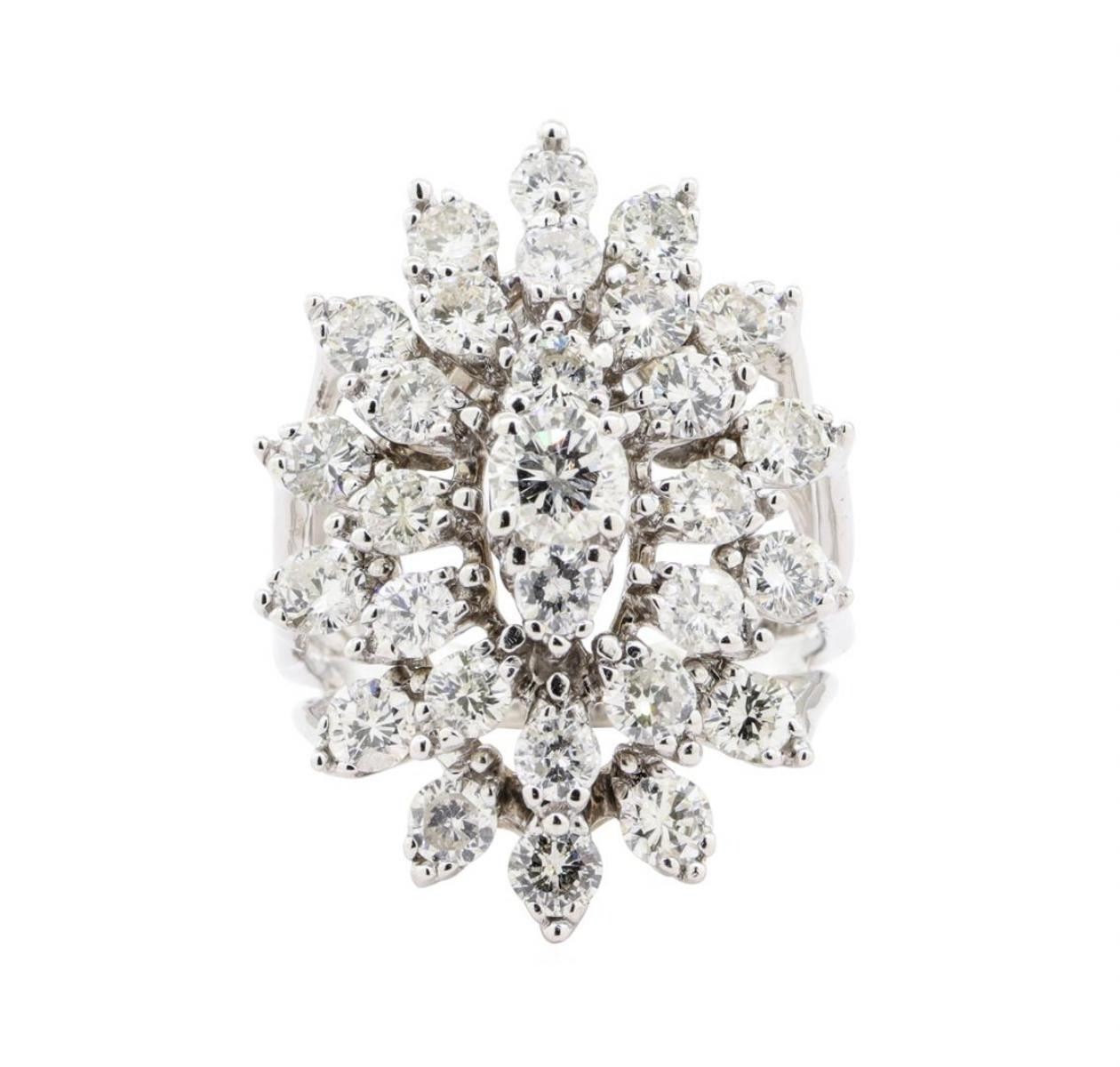 One electronically tested 14KT white gold lady's combination cast & assembled fashion ring with a wire basket halo with a bright polish finish. The featured lady's ring has a shank measuring 3.25 millimeters wide. Condition is Good. Containing: One prong set round brilliant cut diamond, measuring 5.24 - 5.21 x 3.24mm (depth est.) approximate weight of 0.54ct. Graded in the setting. Color I - J Clarity I-1 Cut Very Good Twenty-Eight prong set round brilliant cut diamonds, measuring 3.60 - 3.40 x 2.17mm (depth est.) approximate total weight of 28 Stones = 4.55ct. Graded in the setting. Color H - J Clarity SI-2 to I-1 Cut Good. Total Weight of Diamonds 5.09ct.. Total Weight of Ring 14.40gm GAS Appraised at $15495.00. GAS Appraised.