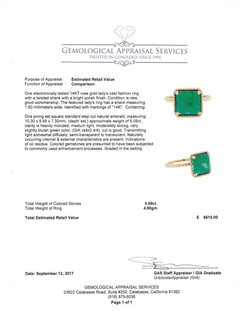 One electronically tested 14KT rose gold lady's cast fashion ring with a twisted shank with a bright polish finish. The featured lady's ring has a shank measuring 1.60 millimeters wide. Identified with markings of '14K'. Condition is new, good workmanship. Containing: One prong set square standard step cut natural emerald, measuring 10.30 x 9.95 x 7.30mm, (depth est.) approximate weight of 5.09ct., clarity is heavily included, medium light, moderately strong, very slightly bluish green color, (GIA vslbG 4/4), cut is good. Transmitting light somewhat diffusely, semi-transparent to translucent. Naturally occurring internal & external characteristics are present. Indications of oil residue. Colored gemstones are presumed to have been subjected to commonly used enhancement processes. Graded in the setting. Total Weight of Colored Stones 5.09ct.. Total Weight of Ring 4.80gm GAS Appraised at $5610.00. GAS Appraised at $5,610.00.