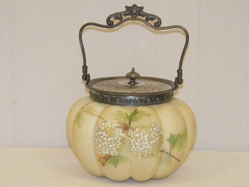 5 1/2" 19TH CENT. SATIN GLASS MELON FORM BISCUIT JAR- CREAM COLORED W/ ENAMELED VERBENIA FLOWERS DECORATION & DECORATED SILVERPLATED COLLAR & LID (MT. WASHINGTON OR SMITH BROS. GLASS CO.) - WEAR & IMPERFECTIONS