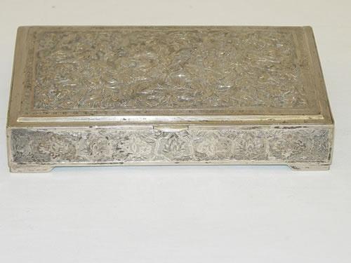 5 1/2" ASIAN SILVER FOOTED BOX W/ REPOUSSE FLOWERS & BIRDS ON LID-HINGED LID, HALLMARKED ON BOTTOM (1" T X 5 1/2" L X 3 1/2" W) - 11 TROY OZ.
