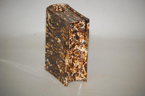 5 1/2" BENNINGTON BOOK FLASK - UNTITLED FLINT GLAZE ENAMEL BENNINGTON BOOK FLASK IN MOTTLED BROWN GLAZE W/ BLUE & YELLOW HIGHLIGHTS (5 1/2" T X 4" W) - APPROX. 1/2" CORNER CHIP, WEAR, IMPERFECTIONS