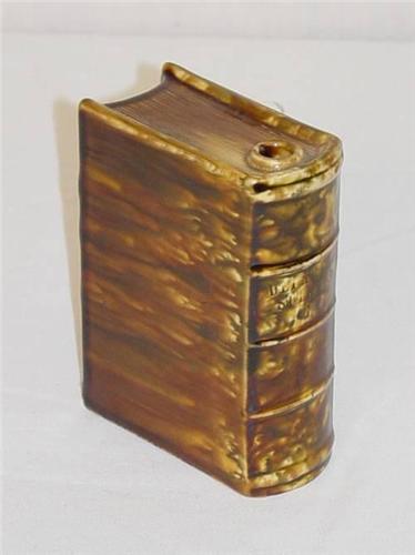 5 1/2" BENNINGTON FLINT ENAMEL POTTERY BOOK FLASK "DEPARTED SPIRITS" - SMALL GLAZE WEAR & CHIPS TO BOOK'S EDGE;