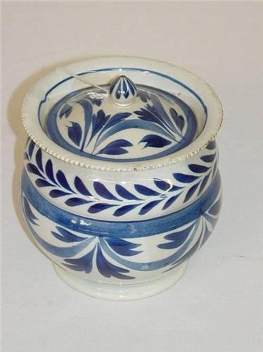 5 1/2" DECORATED SOFT PASTE COVERED SUGAR W/ BLUE BRUSH STROKE DECORATION - CHIP REPAIR TO LID & MINOR STAINING & RIM ROUGHNESS TO BASE;