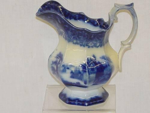 5 1/2" FLOW BLUE CREAMER - SCENIC PATTERN - LIP CHIP and STAINING;