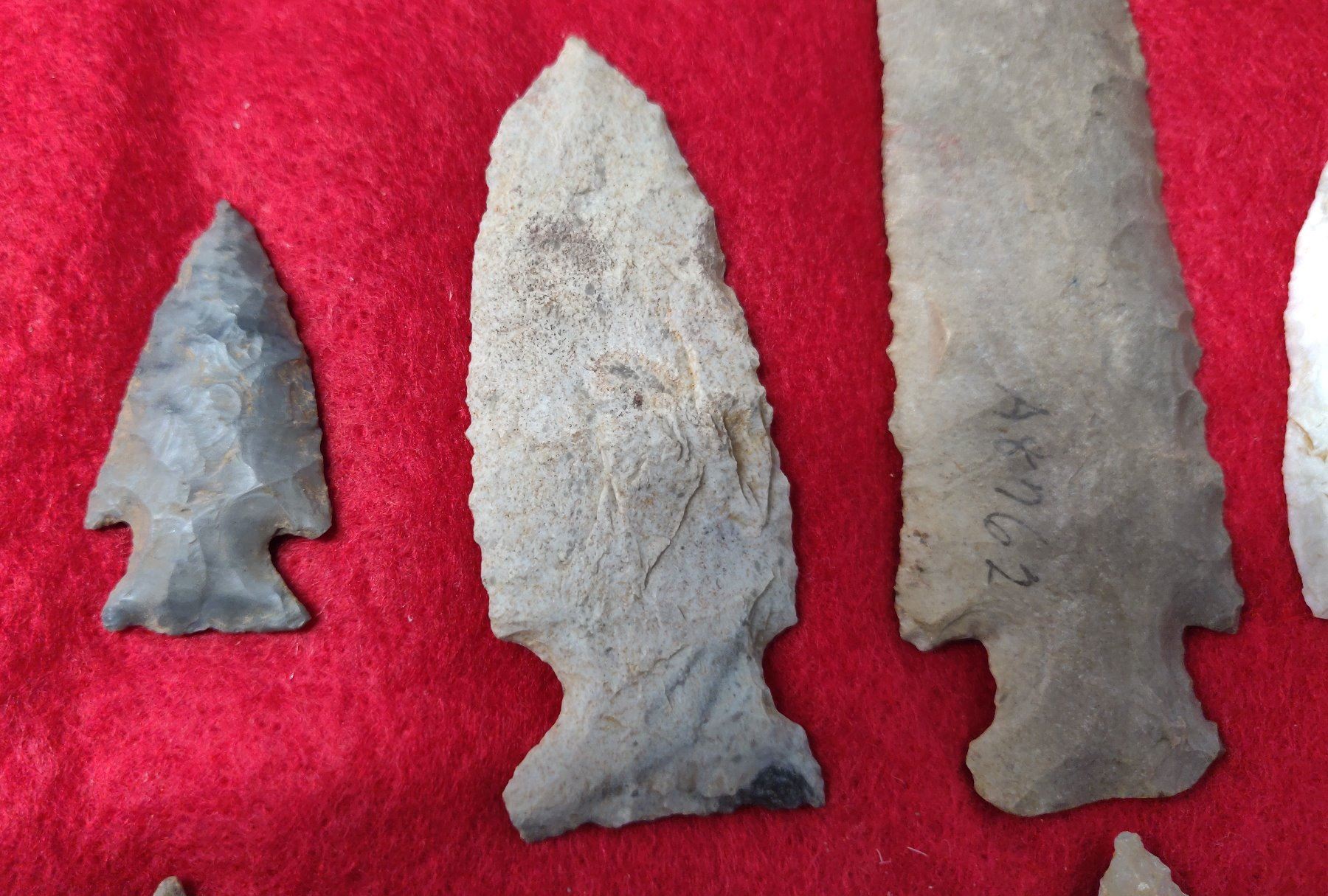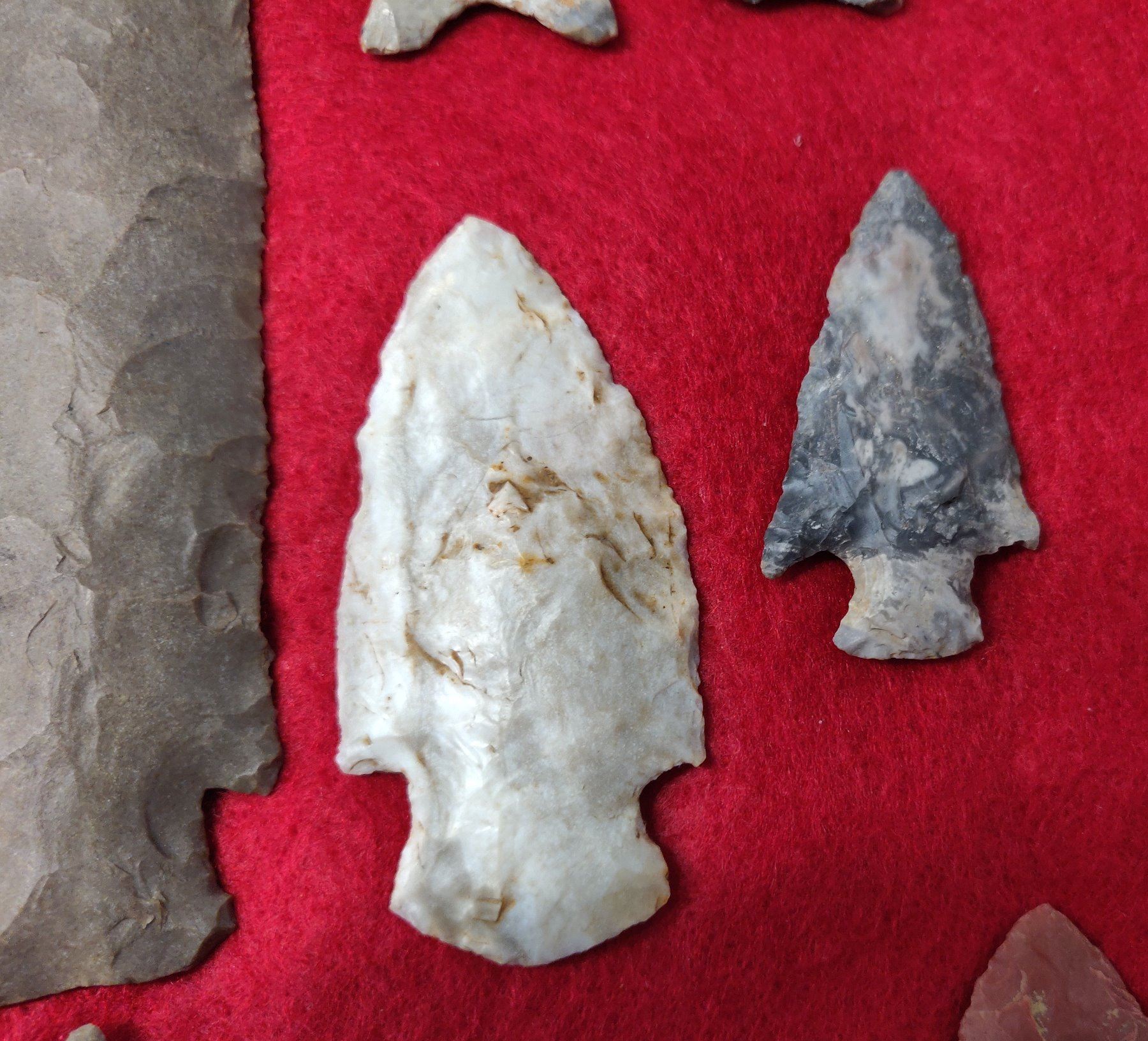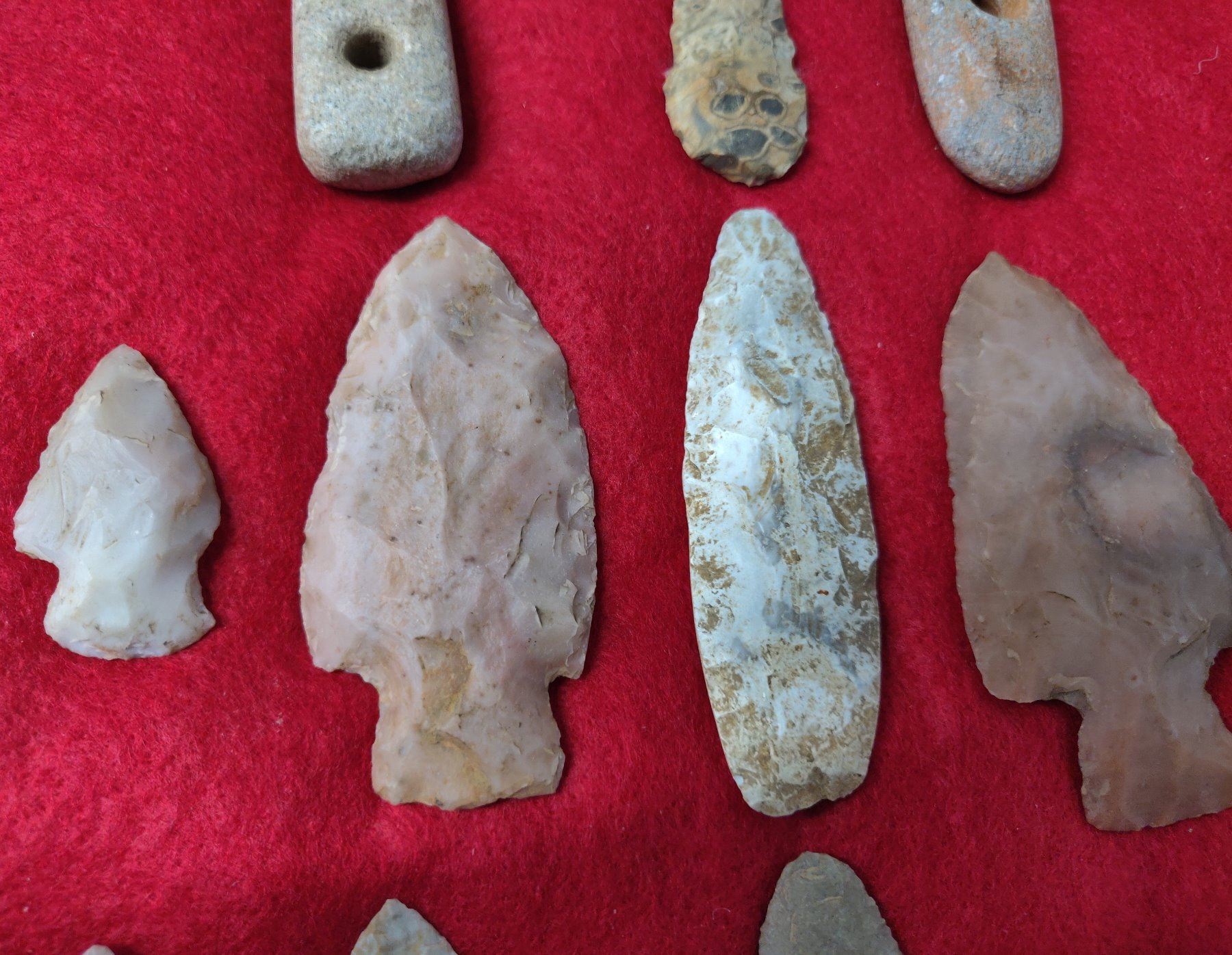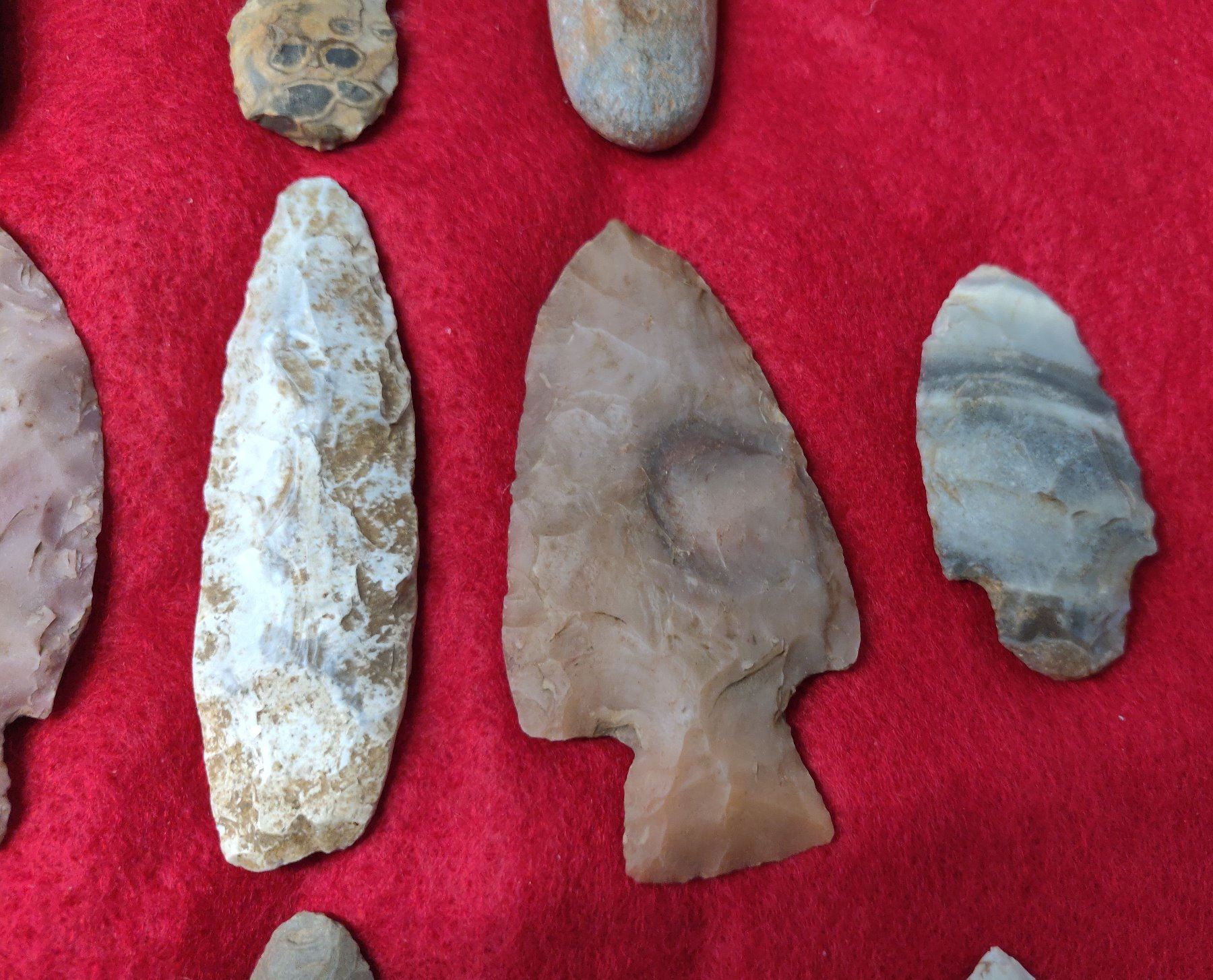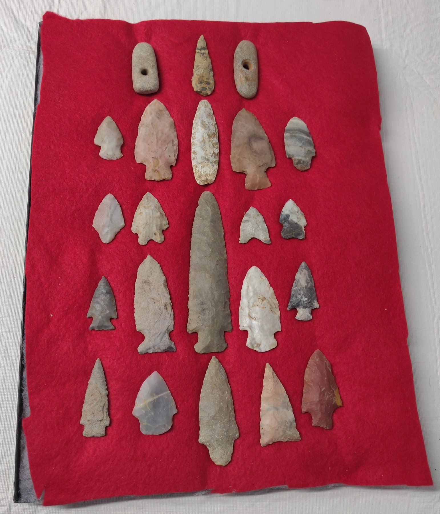 5 1/2" Hardin Spear + Collection, pre-historic items. Made of chert and steatite stone, the longest item measures 5 1/2". Ex-Payne Collection, Indiana. 22 piece collection, frame not included. Found in 1935. Condition: Minor chips, as found, see images. Shipping: $30.00 USA estimate only, w/insurance and signature, due to value and weight.