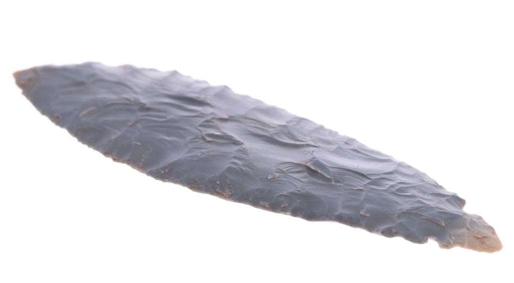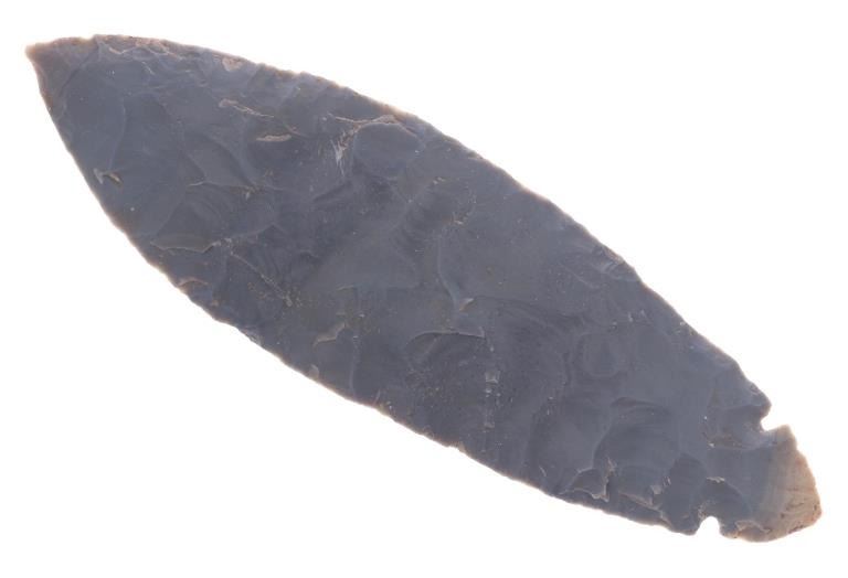 Featured in this lot is this 5 1/2" Hebron Turkeytail flint projectile point. The projectile point features a wonderfully and professionally crafted flint construction that shows expert knapping and a serrated edge. The stem is straight with a triangular point and sid knotches. The condition of this projectile points shows a well preserved stature that shows no obvious signs of damage. The measurements of this point is 5 1/2" x 1 3/4". The collective weight of this point is U6oz.