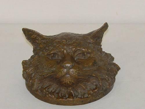 5 1/2" ROUND BASE BRONZE CAT HEAD SCULPTURE SIGNED THEO. A. RUGGLES-KITSON, 1899 - GOOD PATINA and CONDITION;