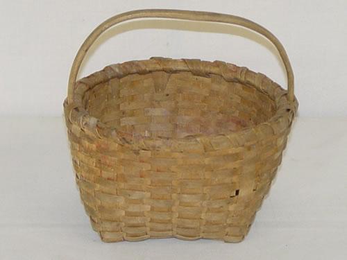 5 1/2" ROUND SPLINT BASKET W/ STATIONARY WOODEN HANDLE - STAINS, BREAKS, & IMPERFECTIONS