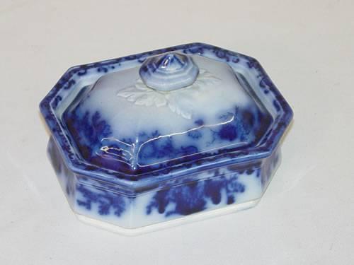 5 1/2" SCINDE FLOW BLUE COVERED SOAP DISH BY ALCOCK - REPAIR TO LID;