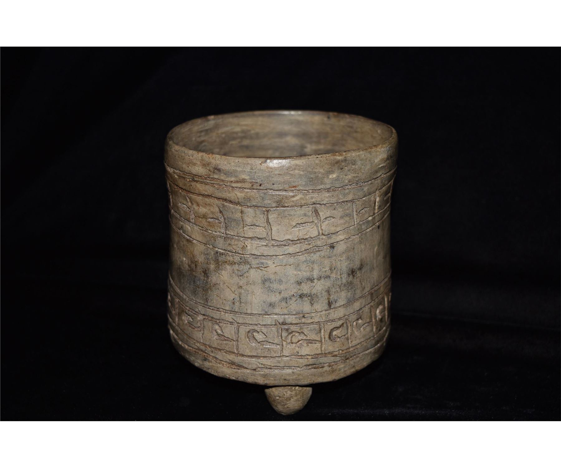 6 1/2" Tall Mayan Tri Leg Vessel, Outstanding Carved Design, Pre Columbian, Ex Herb Mangold Collection