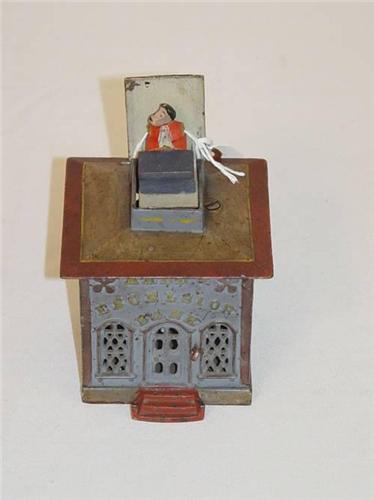 5 1/4" CAST IRON HALLS EXCELSIOR BANK - GOOD PAINT, MINOR WEAR, MAN IN TOP IS MISSING ARMS;