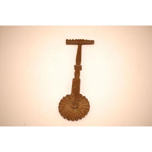 5 1/4" EARLY STEEL JAGGING WHEEL W/ GROOVED TAMPER, CUT SHAPED STEM & GROOVED SPINNING WHEEL - WEAR, OXIDATION, IMPERFECTIONS