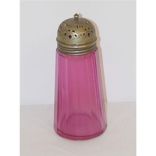 5 1/4" ENGLISH VICTORIAN MUFFINEER - CRANBERRY W/ 12 CUT PANELS & SILVERPLATED LID (EPNS) - WEAR TO PLATING ON LID, WEAR