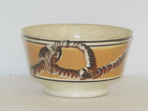 5 1/4" MOCHA WARE CREAMWARE BOWL W/ TRI-COLOR EARTHWORM DECORATION ON PALE ORANGE BACKGROUND & BROWN BANDS ABOVE & BELOW - REPAIRS TO BODY & BASE, IMPERFECTIONS
