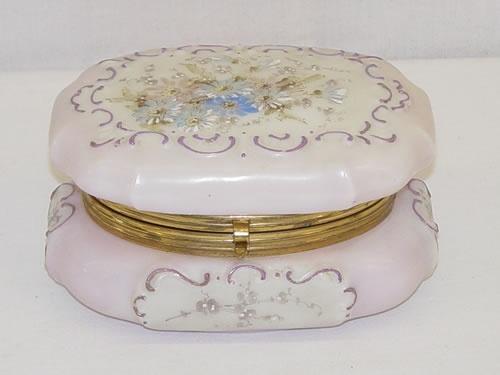 5 1/4" PINK WAVECREST DRESSER BOX W/ FLORAL DECORATION, BRASS FITTING & CLASP-MARKED ON BASE - NO LINER, MINOR WEAR