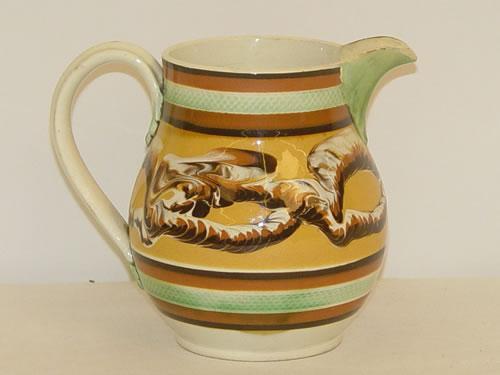 5 1/8" MOCHA WARE PEARLWARE BULBOUS PITCHER W/ DOUBLE ENTWINED TRI-COLOR EARTHWORM DECORATION ON WIDE MUSTARD BAND W/ 2 GREEN ROULETTED BANDS & DOUBLE OCHRE & BROWN BANDS ABOVE & BELOW - HANDLE W/ GREEN TOP & BOTTOM, SPOUT REPAIRED, CRAZING