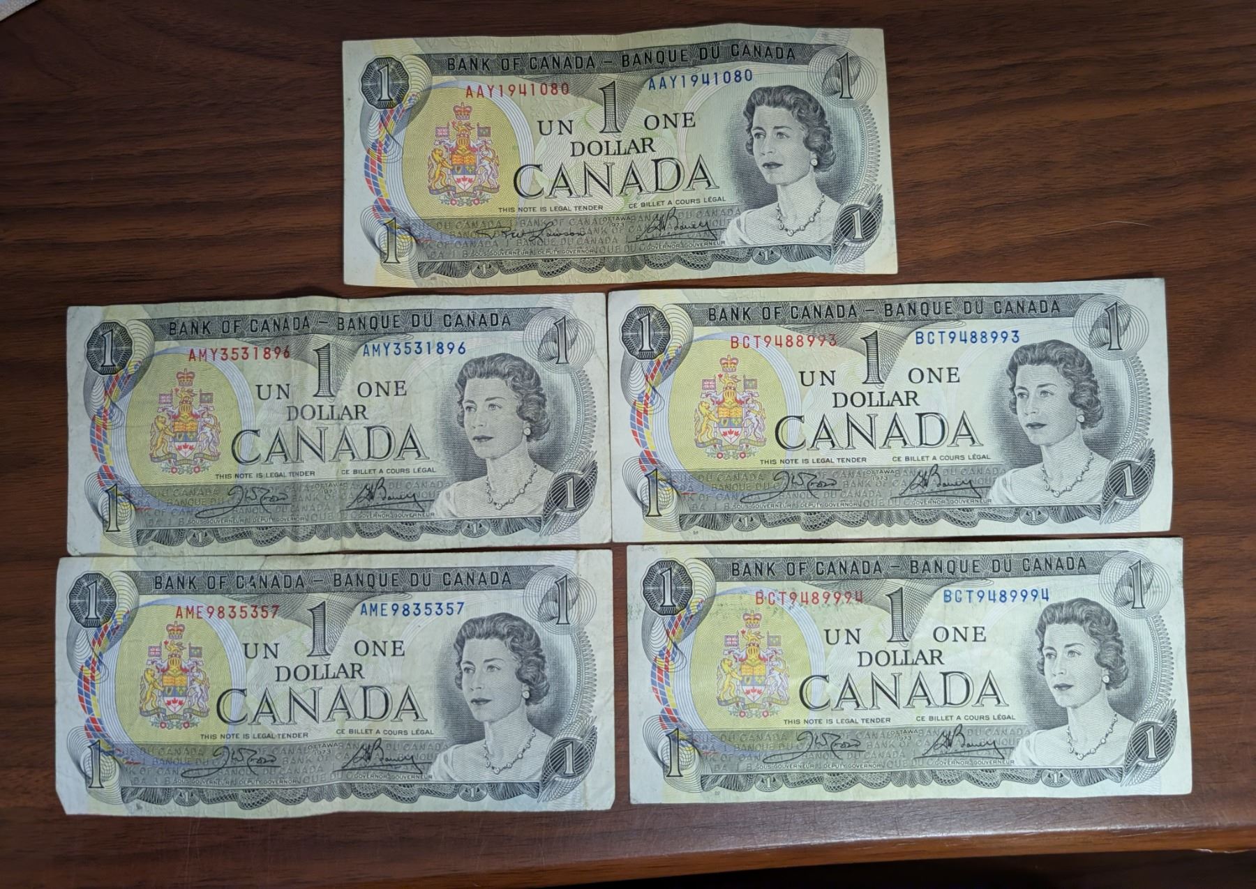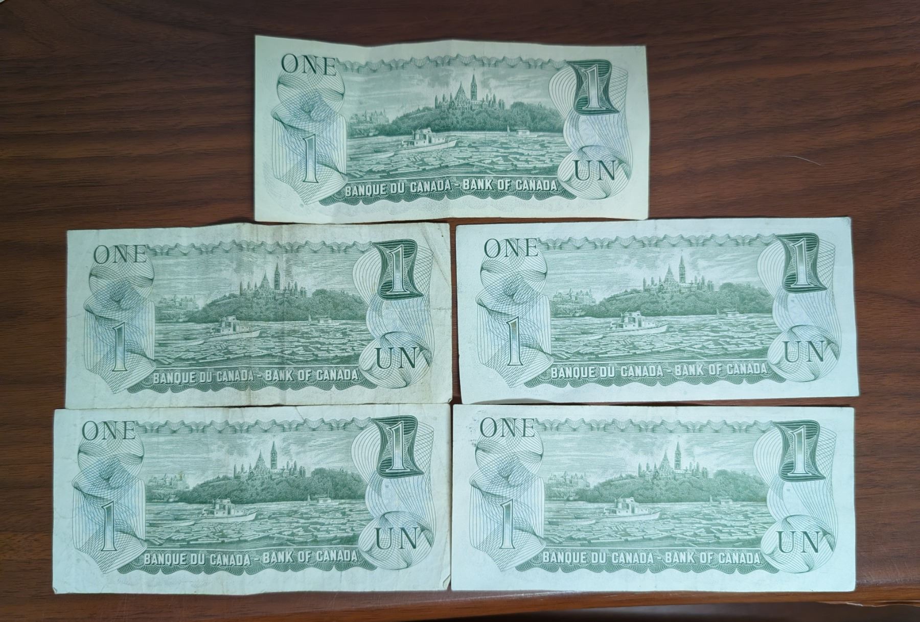 (5) 1 Dollar Canadian Bills (1973) (2) in Sequence Order (BCT9488993 and BCT948994)