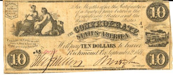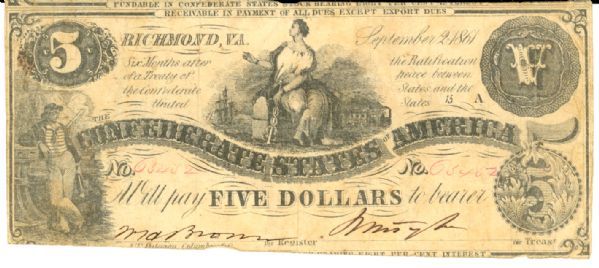 $5 & $10 1861 Confederate notes. Lightly circulated notes in good condition that are ideal for a Confederate type collection.