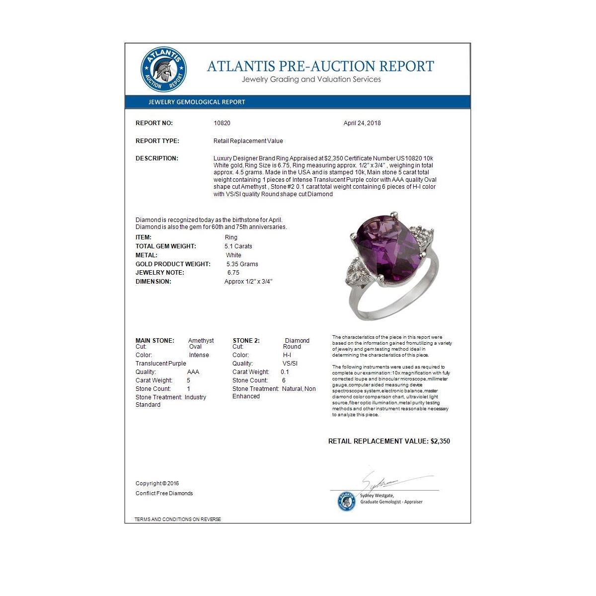 REF-35H6A -10820 ---- 5.10 CTW Amethyst & Diamond Ring 10K White Gold ---- Luxury Designer Brand Ring Appraised at $2,350 Certificate Number US10820 10k White gold, Ring Size is 6.75, Ring measuring approx. 1/2" x 3/4" , weighing in total approx. 4.5 grams. Made in the USA and is stamped 10k, Main stone 5 carat total weight containing 1 pieces of Intense Translucent Purple color with AAA quality Oval shape cut Amethyst , Stone #2 0.1 carat total weight containing 6 pieces of H-I color with VS/SI quality Round shape cut Diamond