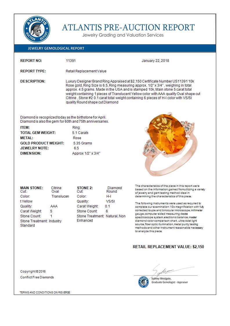 REF-35Y6K -11391 ---- 5.10 CTW Citrine & Diamond Ring 10K Rose Gold ---- Luxury Designer Brand Ring Appraised at $2,150 Certificate Number US11391 10k Rose gold, Ring Size is 6.5, Ring measuring approx. 1/2" x 3/4" , weighing in total approx. 4.5 grams. Made in the USA and is stamped 10k, Main stone 5 carat total weight containing 1 pieces of Translucent Yellow color with AAA quality Oval shape cut Citrine , Stone #2 0.1 carat total weight containing 6 pieces of H-I color with VS/SI quality Round shape cut Diamond