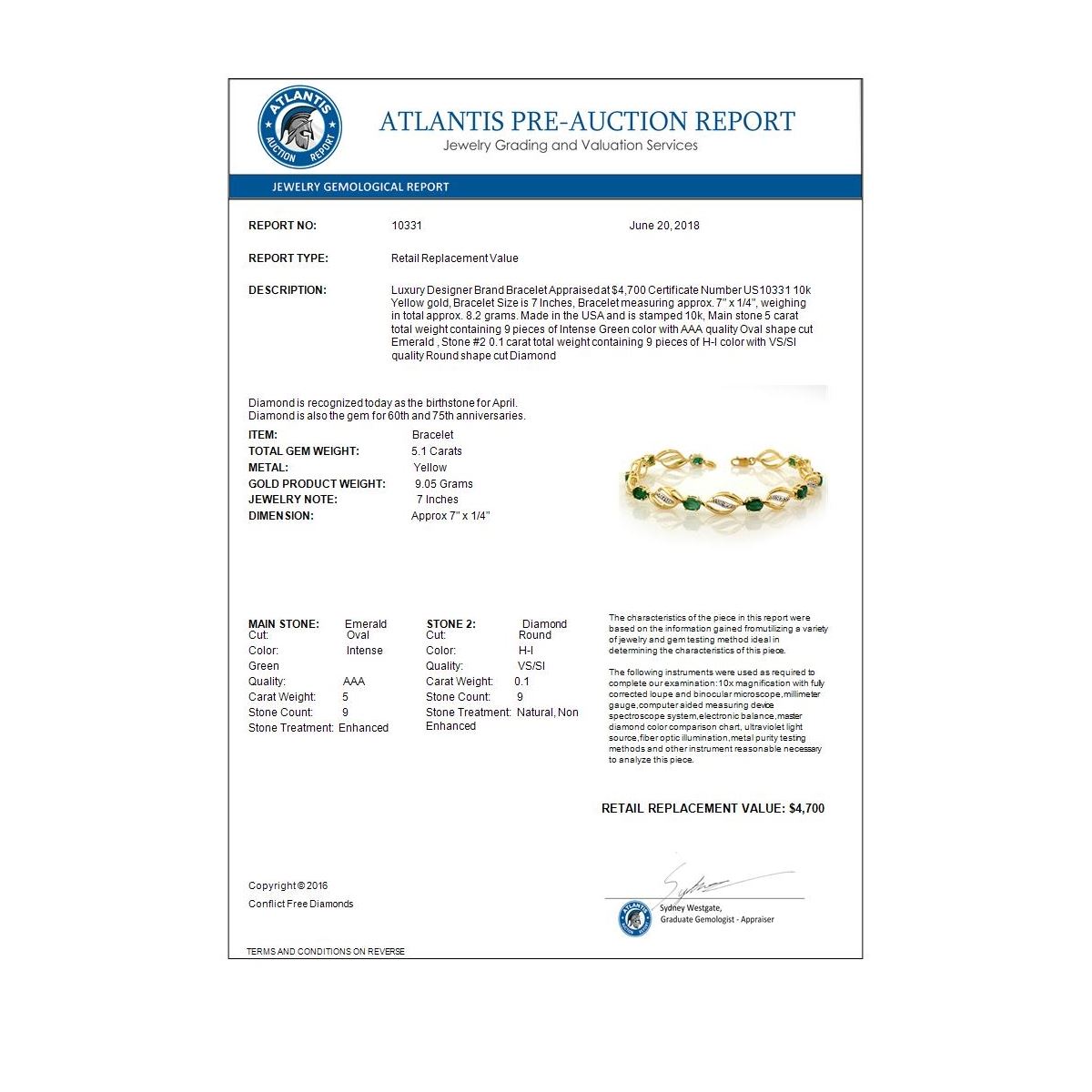 REF-70X9T -10331 ---- 5.10 CTW Emerald & Diamond Bracelet 10K Yellow Gold ---- Luxury Designer Brand Bracelet Appraised at $4,700 Certificate Number US10331 10k Yellow gold, Bracelet Size is 7 Inches, Bracelet measuring approx. 7" x 1/4", weighing in total approx. 8.2 grams. Made in the USA and is stamped 10k, Main stone 5 carat total weight containing 9 pieces of Intense Green color with AAA quality Oval shape cut Emerald , Stone #2 0.1 carat total weight containing 9 pieces of H-I color with VS/SI quality Round shape cut Diamond