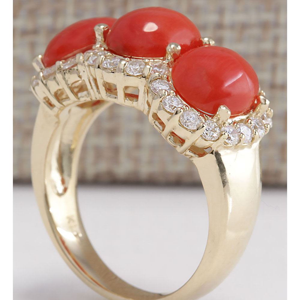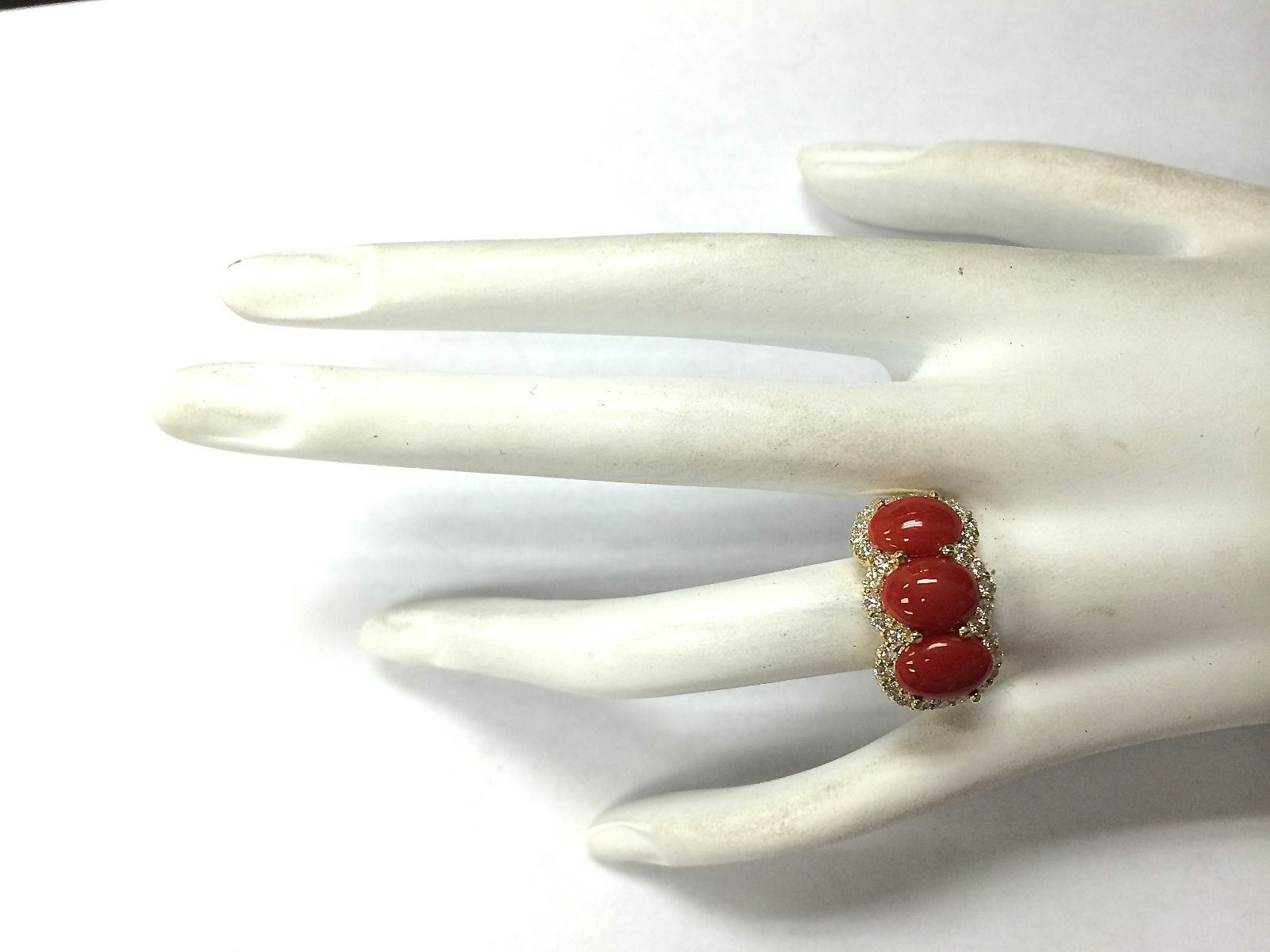 5.10 CTW Natural Red Coral And Diamond Ring 18K Solid Yellow Gold