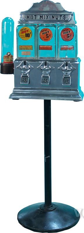 5 & 10 Cent Electric "The Challenger" Triple Hot Nut Vending Machine by Tropical Trading Co. Chicago, ILL. on metal stand w/ side cup dispenser & keys