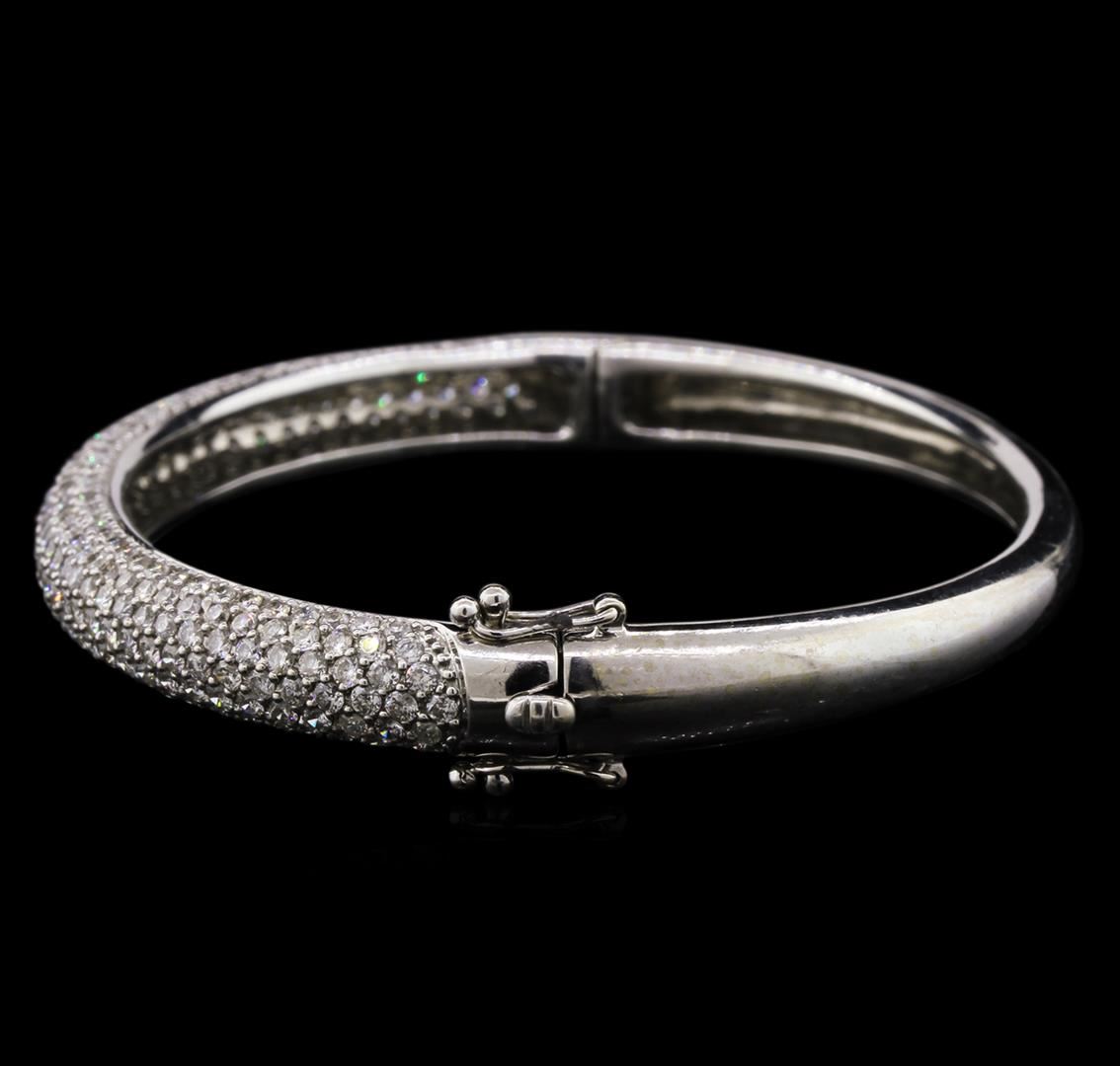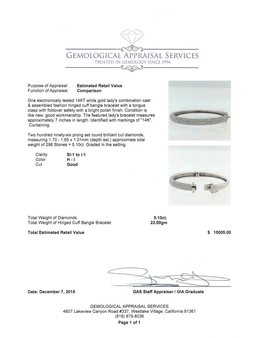 One electronically tested 14KT white gold lady's combination cast & assembled fashion hinged cuff bangle bracelet with a tongue clasp with foldover safety with a bright polish finish. The featured lady's bracelet measures approximately 7 inches in length. Identified with markings of "14K". Condition is like new, good workmanship. Containing: Two Hundred Ninety-Six prong set round brilliant cut diamonds, measuring 1.70 - 1.65 x 1.01mm (depth est.) approximate total weight of 296 Stones = 5.10ct. Graded in the setting. Clarity: SI-1 to I-1. Color: H - I. Cut Good. Total Weight of Diamonds 5.10ct. Total Weight of Hinged Cuff Bangle Bracelet 22.00gm. GAS Appraised at $15,005.00.