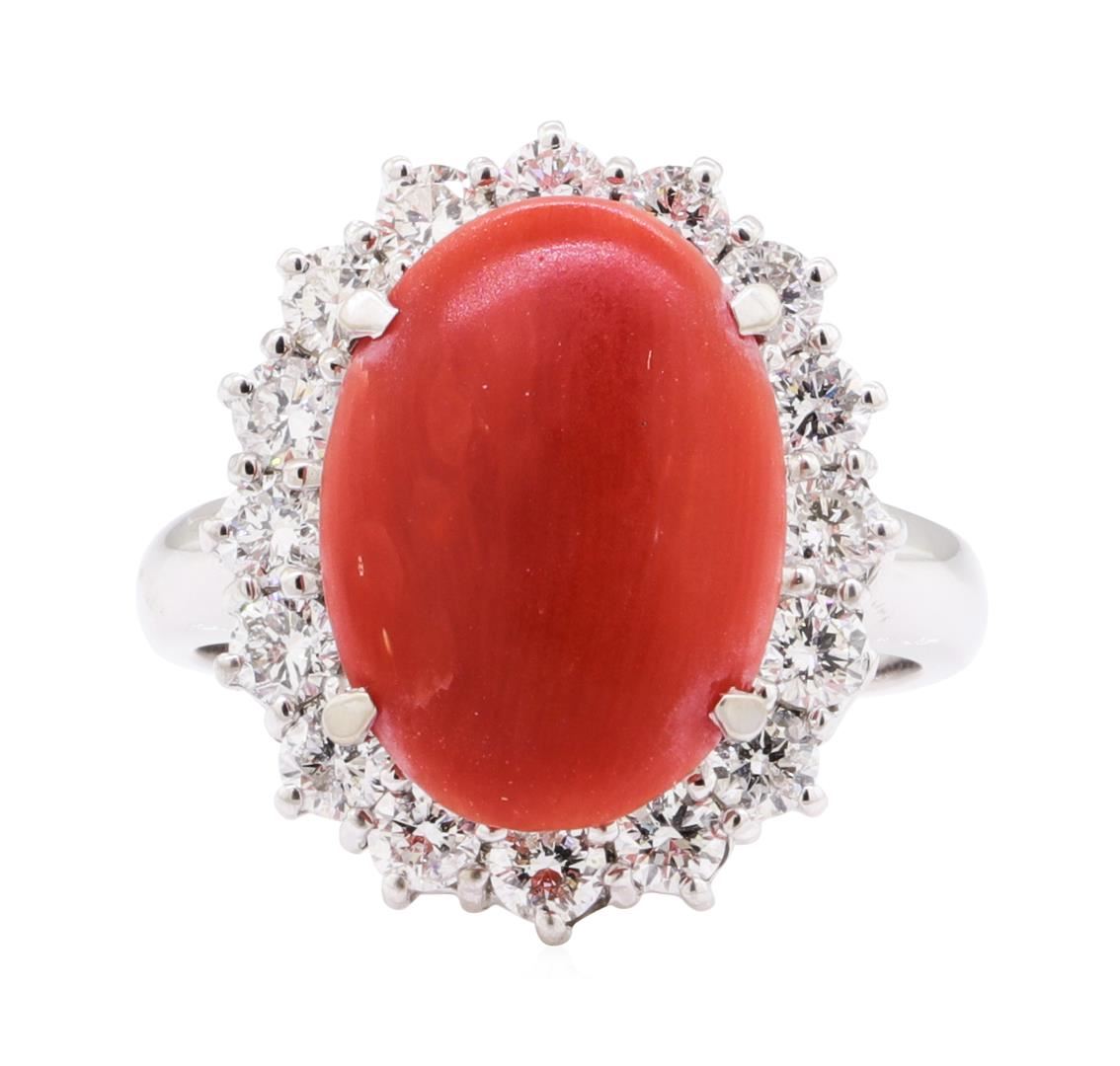 One electronically tested 14KT white gold lady's cast fashion ring with a oval halo with a bright polish finish. The featured lady's ring has a shank measuring 2.60 millimeters wide. Identified with markings of 'K14'. Condition is new, good workmanship. Containing: One prong set oval cabochon standard cut natural red coral, measuring 14.99 x 10.90 x 3.18mm, (depth est.) 20%. bulge factor, approximate weight of 3.95ct., medium, slightly brownish, orangy red color, (GIA oR 5/2), cut is good. Colored gemstones are presumed to have been subjected to commonly used enhancement processes. Graded in the setting. Sixteen prong set round brilliant cut diamonds, measuring 2.70 - 2.60 x 1.64mm (depth est.) approximate total weight of 16 Stones = 1.15ct. Graded in the setting. Color G - H Clarity VS-2 to SI-2 Cut Very Good. Total Weight of Colored Stones 3.95ct.. Total Weight of Diamonds 1.15ct.. Total Weight of Ring 6.00gm GAS Appraised at $5105.00. GAS Appraised at $5,105.00.