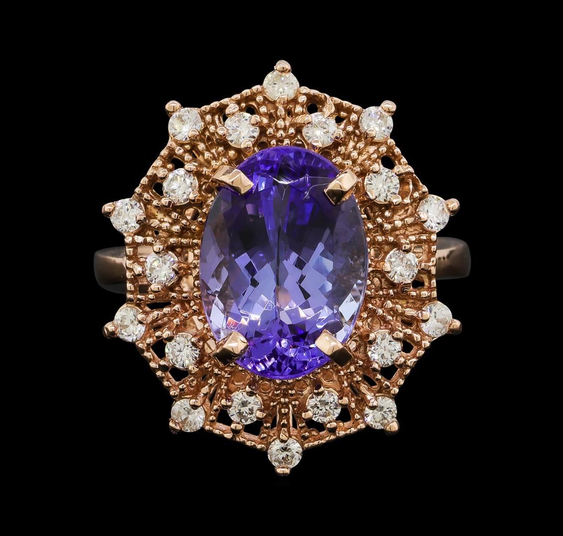 One electronically tested 14KT rose gold lady's cast fashion ring with a double basket halo with a bright polish with milgrain detailing finish. The featured lady's ring has a shank measuring 2.64 millimeters wide. Identified with markings of 'K14'. Condition is new, good workmanship. Containing: One prong set oval modified brilliant cut natural tanzanite, measuring 12.46 x 9.12 x 6.24mm, (depth est.) approximate weight of 5.10ct., clarity is eye clean, medium, very slightly grayish, violetish blue color, (GIA vB 5/3), cut is very good. Transmitting light with no distortion, transparent. Colored gemstones are presumed to have been subjected to commonly used enhancement processes. Graded in the setting. Twenty prong set round brilliant cut diamonds, measuring 1.90 - 1.80 x 1.15mm (depth est.) approximate total weight of 20 Stones = 0.49ct. Graded in the setting. Clarity SI-1 to SI-2. Color: H - I Cut Good. Total Weight of Colored Stones 5.10ct.. Total Weight of Diamonds 0.49ct.. Total Weight of Ring 6.90gm.