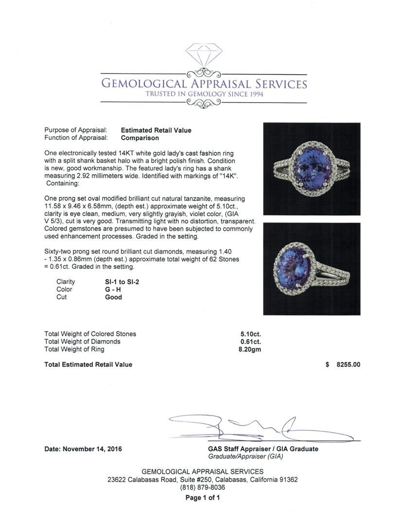 One electronically tested 14KT white gold lady's cast fashion ring with a split shank basket halo with a bright polish finish. The featured lady's ring has a shank measuring 2.92 millimeters wide. Identified with markings of '14K'. Condition is new, good workmanship. Containing: One prong set oval modified brilliant cut natural tanzanite, measuring 11.58 x 9.46 x 6.58mm, (depth est.) approximate weight of 5.10ct., clarity is eye clean, medium, very slightly grayish, violet color, (GIA V 5/3), cut is very good. Transmitting light with no distortion, transparent. Colored gemstones are presumed to have been subjected to commonly used enhancement processes. Graded in the setting. Sixty-Two prong set round brilliant cut diamonds, measuring 1.40 - 1.35 x 0.86mm (depth est.) approximate total weight of 62 Stones = 0.61ct. Graded in the setting. Clarity SI-1 to SI-2. Color: G - H Cut Good. Total Weight of Colored Stones 5.10ct.. Total Weight of Diamonds 0.61ct.. Total Weight of Ring 8.20gm GAS Appraised at $8,255.00.