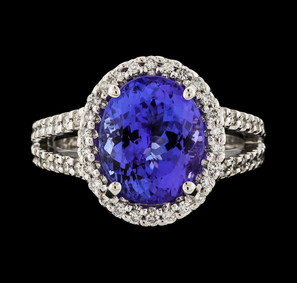 One electronically tested 14KT white gold lady's cast fashion ring with a split shank basket halo with a bright polish finish. The featured lady's ring has a shank measuring 2.92 millimeters wide. Identified with markings of '14K'. Condition is new, good workmanship. Containing: One prong set oval modified brilliant cut natural tanzanite, measuring 11.58 x 9.46 x 6.58mm, (depth est.) approximate weight of 5.10ct., clarity is eye clean, medium, very slightly grayish, violet color, (GIA V 5/3), cut is very good. Transmitting light with no distortion, transparent. Colored gemstones are presumed to have been subjected to commonly used enhancement processes. Graded in the setting. Sixty-Two prong set round brilliant cut diamonds, measuring 1.40 - 1.35 x 0.86mm (depth est.) approximate total weight of 62 Stones = 0.61ct. Graded in the setting. Clarity SI-1 to SI-2. Color: G - H Cut Good. Total Weight of Colored Stones 5.10ct.. Total Weight of Diamonds 0.61ct.. Total Weight of Ring 8.20gm GAS Appraised at $8,255.00.