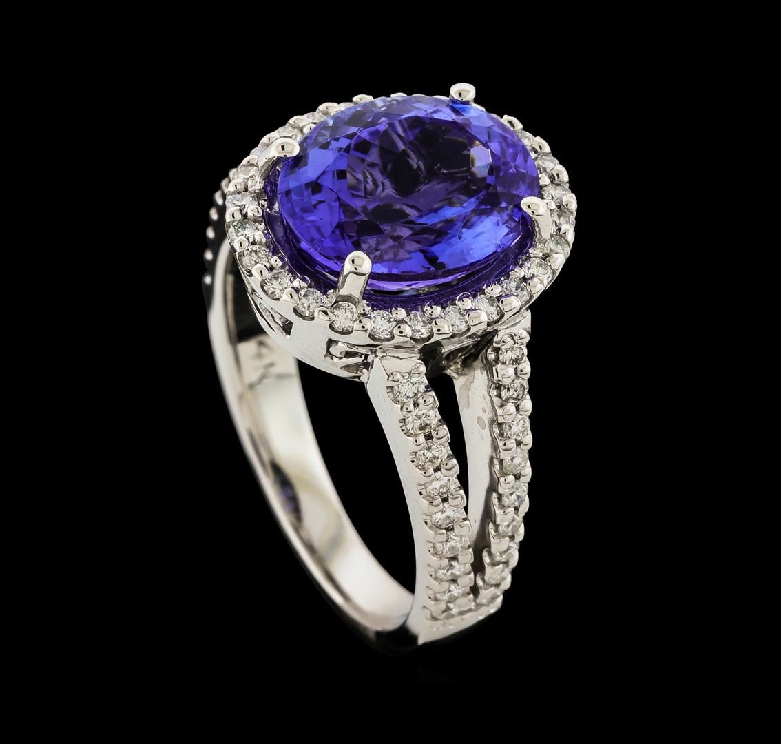 One electronically tested 14KT white gold lady's cast fashion ring with a split shank basket halo with a bright polish finish. The featured lady's ring has a shank measuring 2.92 millimeters wide. Identified with markings of '14K'. Condition is new, good workmanship. Containing: One prong set oval modified brilliant cut natural tanzanite, measuring 11.58 x 9.46 x 6.58mm, (depth est.) approximate weight of 5.10ct., clarity is eye clean, medium, very slightly grayish, violet color, (GIA V 5/3), cut is very good. Transmitting light with no distortion, transparent. Colored gemstones are presumed to have been subjected to commonly used enhancement processes. Graded in the setting. Sixty-Two prong set round brilliant cut diamonds, measuring 1.40 - 1.35 x 0.86mm (depth est.) approximate total weight of 62 Stones = 0.61ct. Graded in the setting. Clarity SI-1 to SI-2. Color: G - H Cut Good. Total Weight of Colored Stones 5.10ct.. Total Weight of Diamonds 0.61ct.. Total Weight of Ring 8.20gm GAS Appraised at $8,255.00.